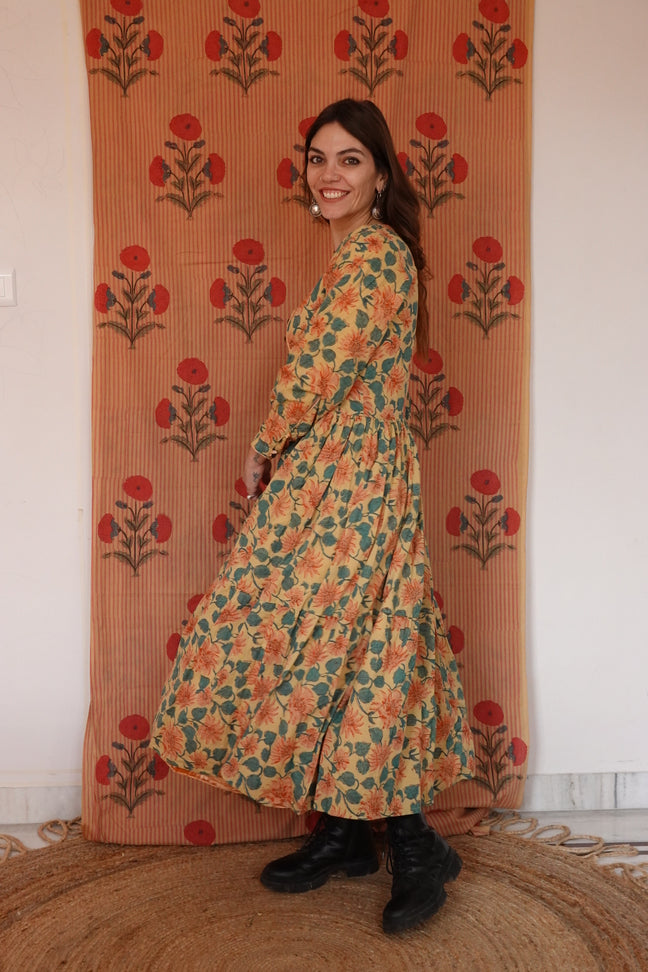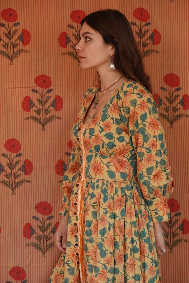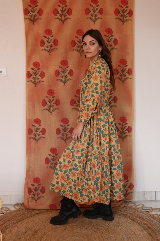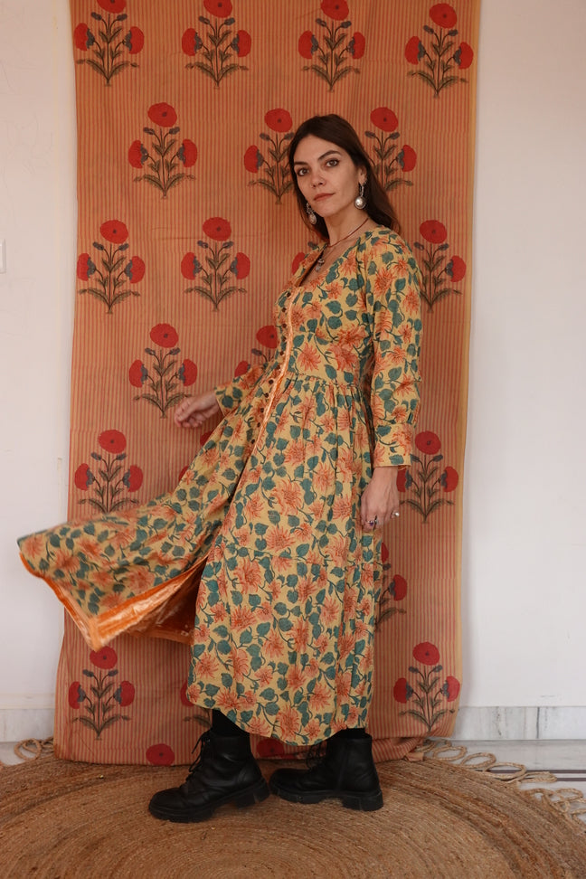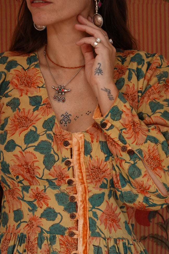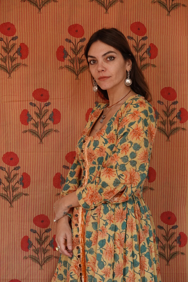 L’abito Tara è una delle novità più speciali di questa collezione: caldo, morbido, ma soprattutto completamente reversibile grazie all’interno in cotone block print e la doppia abbottonatura sia nella parte frontale dell'abito che nelle maniche!