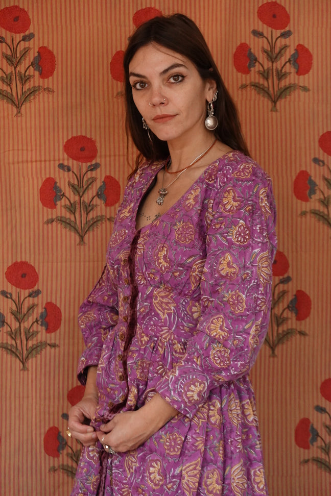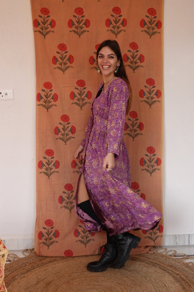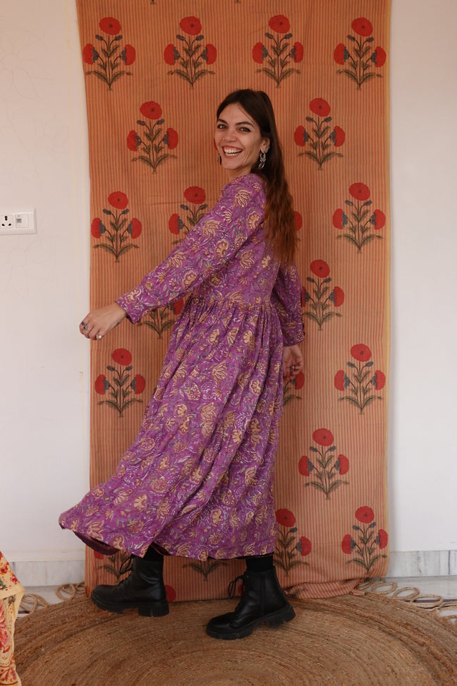 L’abito Tara è una delle novità più speciali di questa collezione: caldo, morbido, ma soprattutto completamente reversibile grazie all’interno in cotone block print e la doppia abbottonatura sia nella parte frontale dell'abito che nelle maniche!