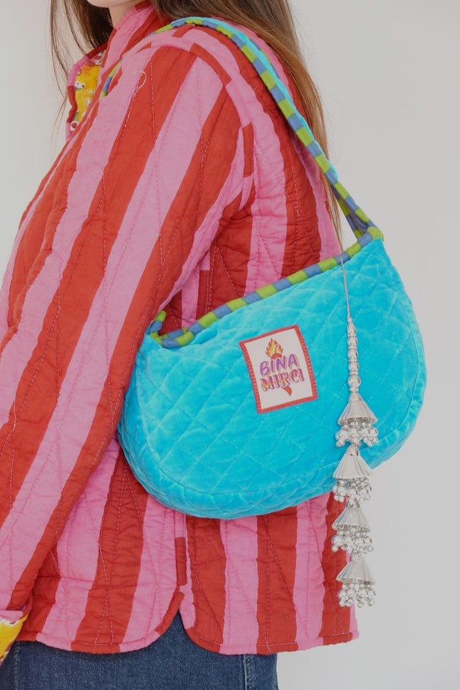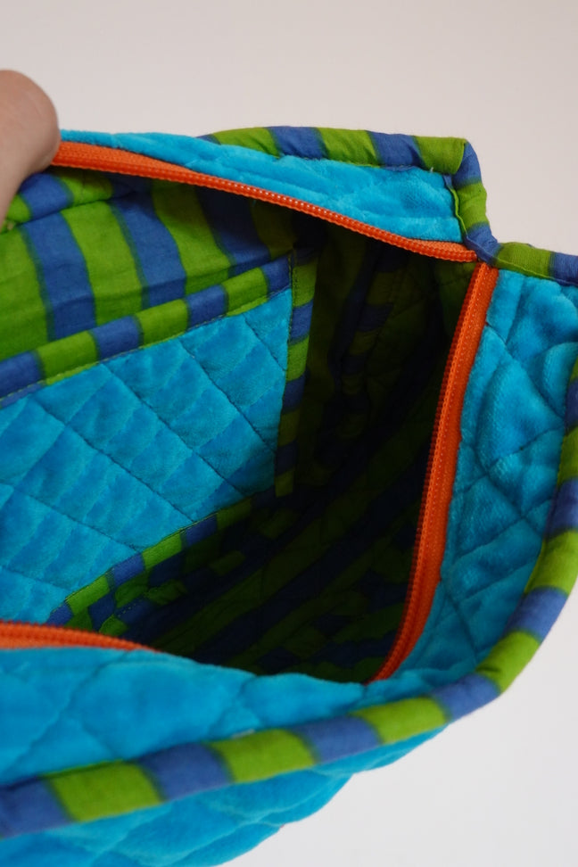 Il tessuto è velluto di cotone, e i dettagli a righe sono in cotone screen print - lo trovi anche all'interno, insieme a un pratico taschino!
