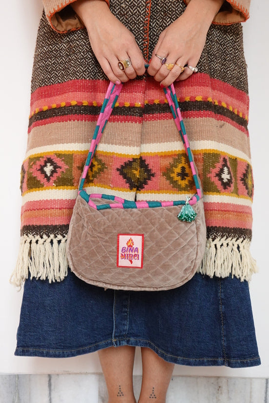 Il tessuto è velluto di cotone, e i dettagli a righe sono in cotone screen print - lo trovi anche all'interno, insieme a un pratico taschino!