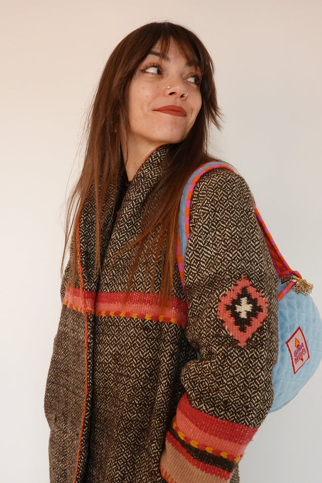 La zip è impreziosita da un letkan: qui in india si utilizzano per abbellire gonne e blouse, e danno un tocco in più alla borsa :)