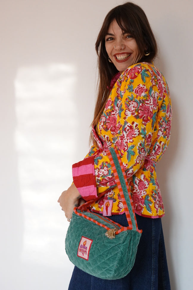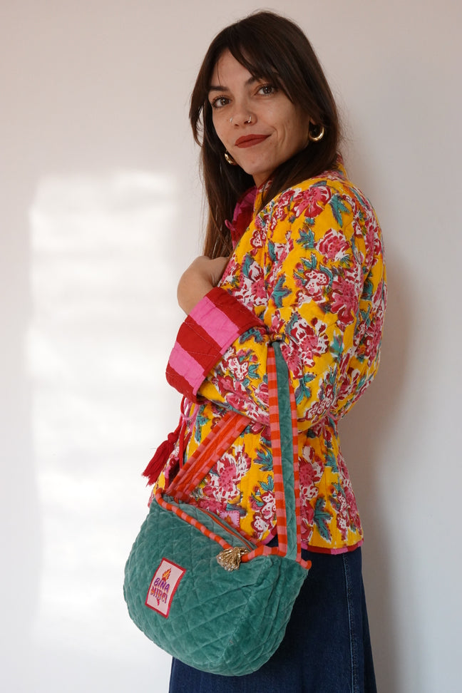 Il tessuto è velluto di cotone, e i dettagli a righe sono in cotone screen print - lo trovi anche all'interno, insieme a un pratico taschino!