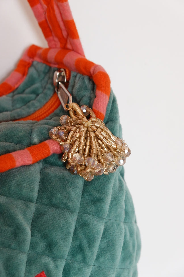 La zip è impreziosita da un letkan: qui in india si utilizzano per abbellire gonne e blouse, e danno un tocco in più alla borsa :)