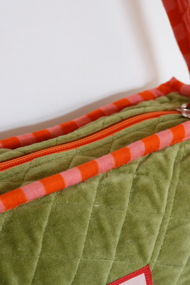 Il tessuto è velluto di cotone, e i dettagli a righe sono in cotone screen print - lo trovi anche all'interno, insieme a un pratico taschino!