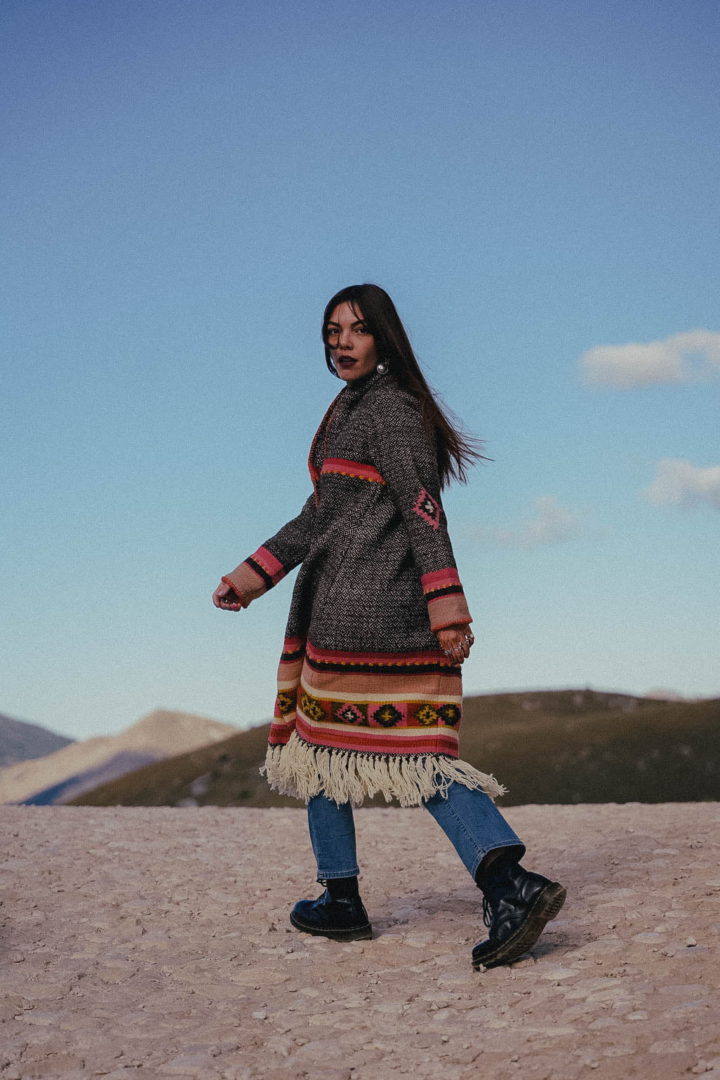 Le maniche e la profilatura frontale del cappotto sono rifinite a mano con un punto festone; i motivi geometrici che decorano il cappotto sono ispirati ai motivi kullvi, ovvero i tipici motivi della zona di Kullu - il distretto che ospita Naggar: questi motivi cambiano a seconda dell'occasione in cui si indossa il capo su cui sono tessuti.