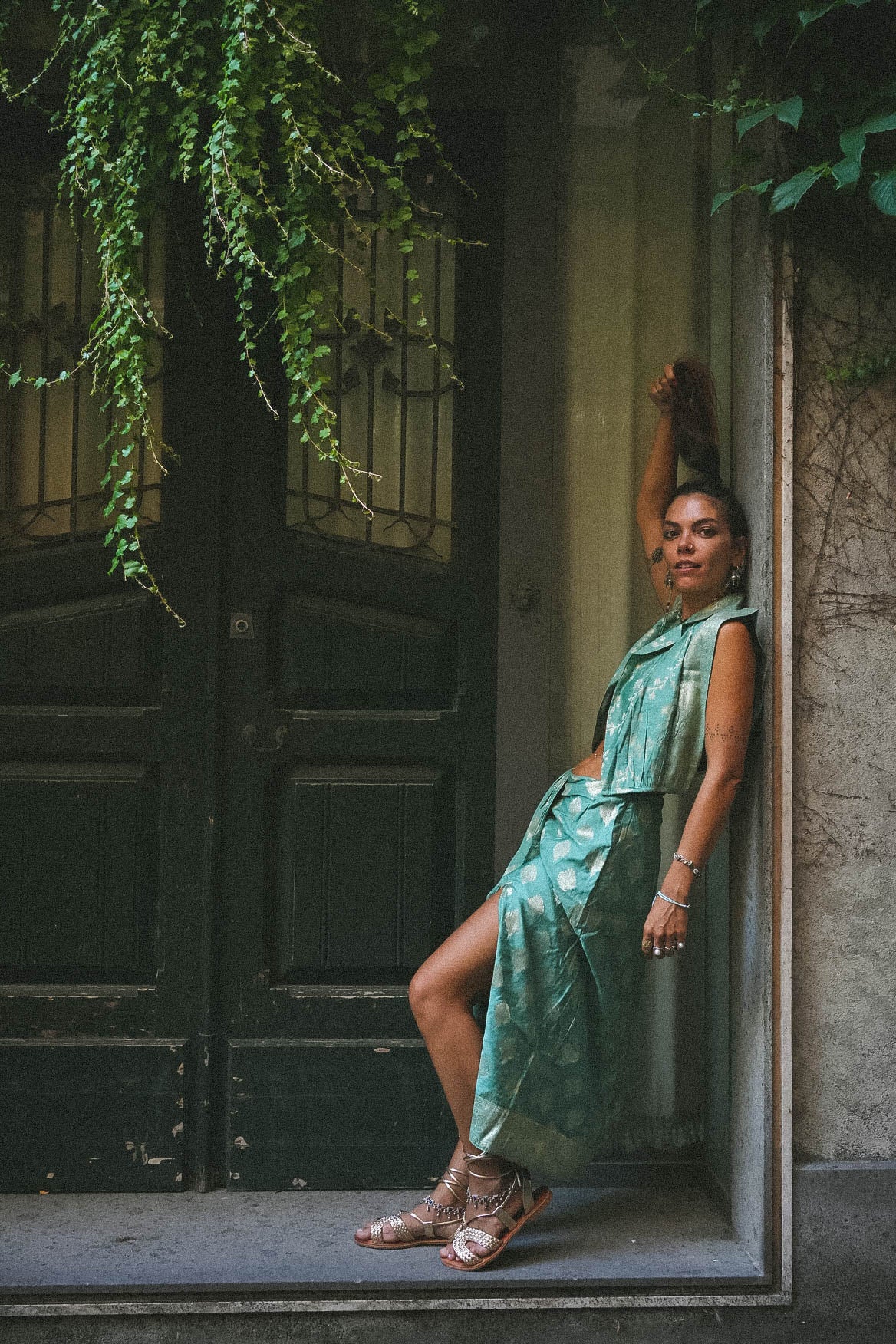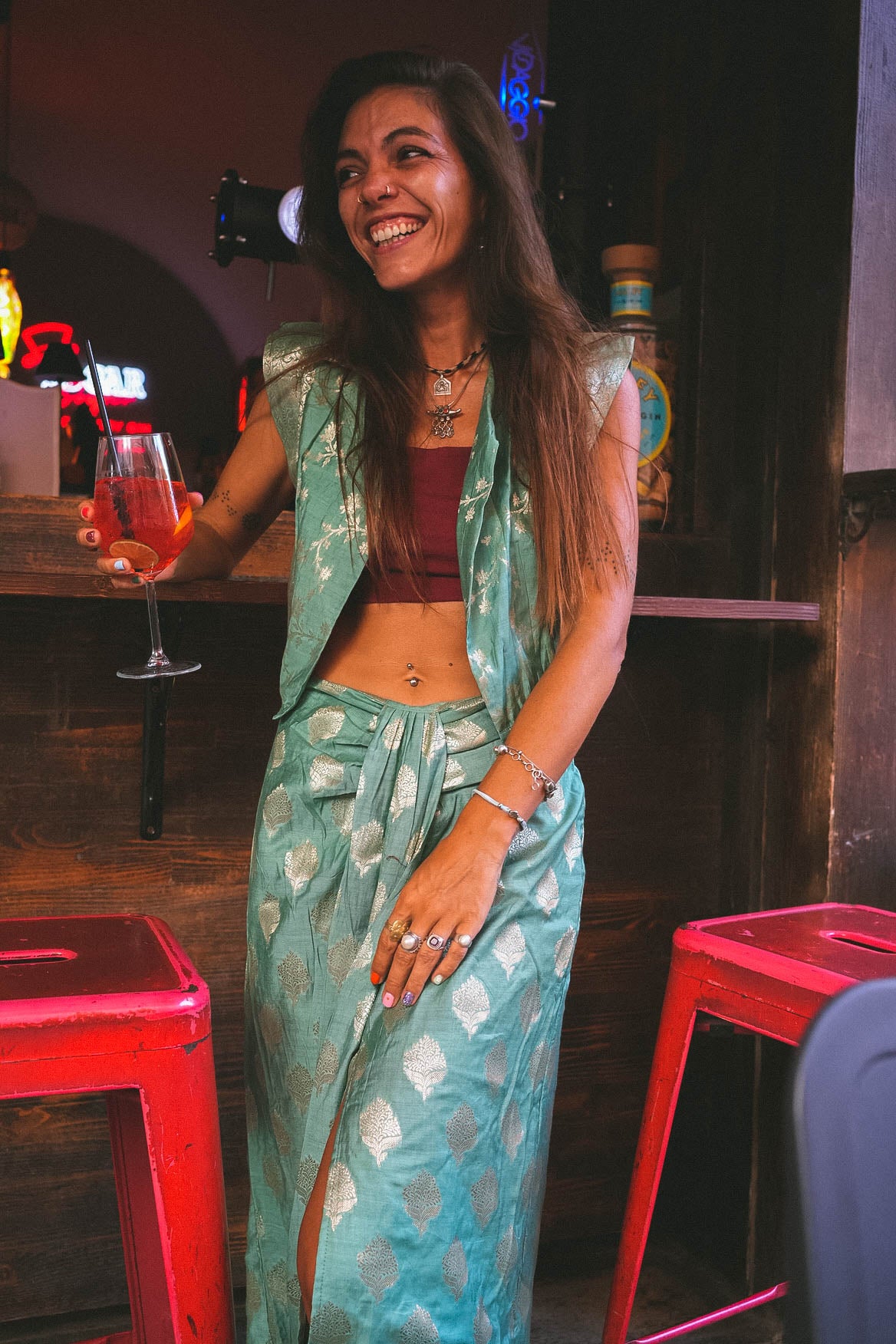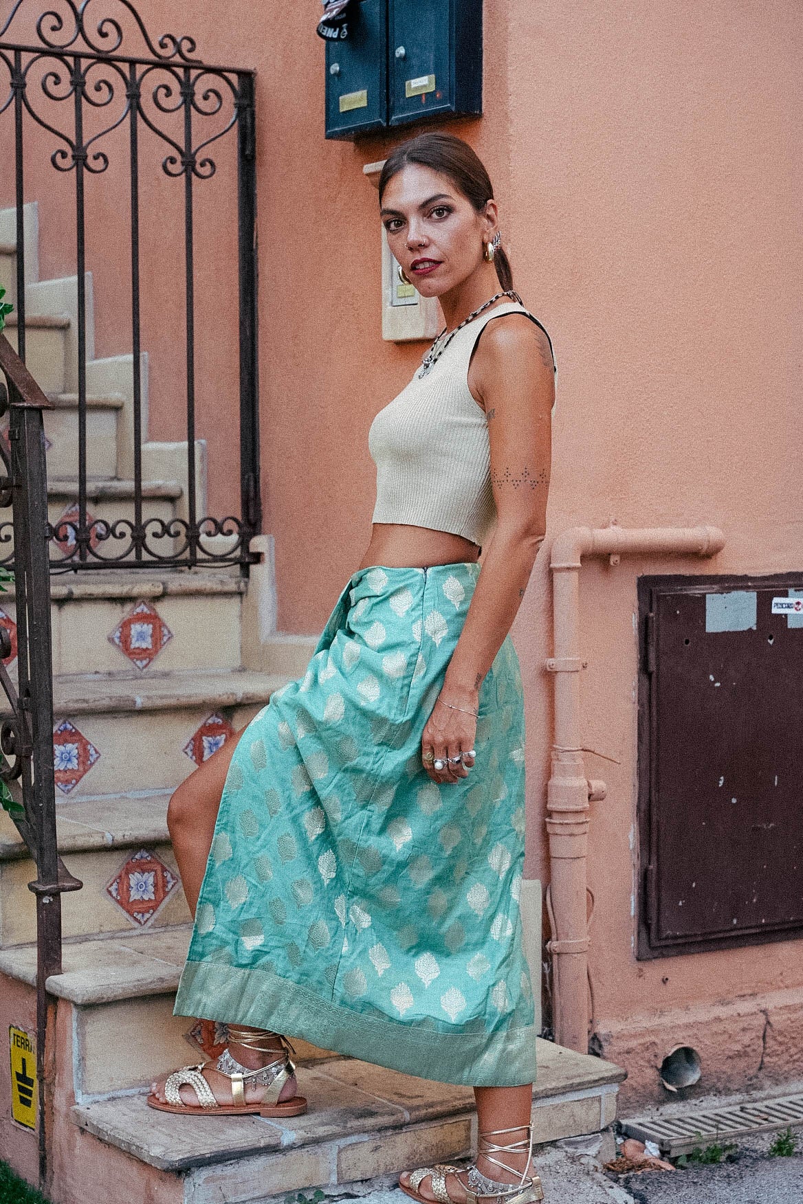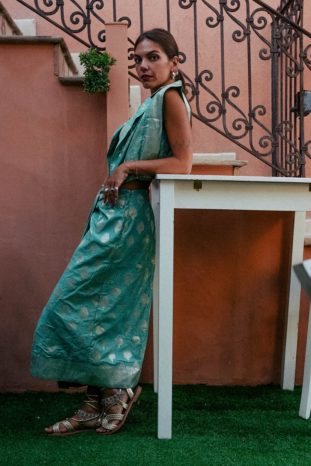 La gonna è ispirata ai saree delle donne indiane, con una piccola cascata di tessuto sul davanti che richiama appunto il davanti dei saree, ha uno spacco frontale e si chiude con una zip laterale nascosta.