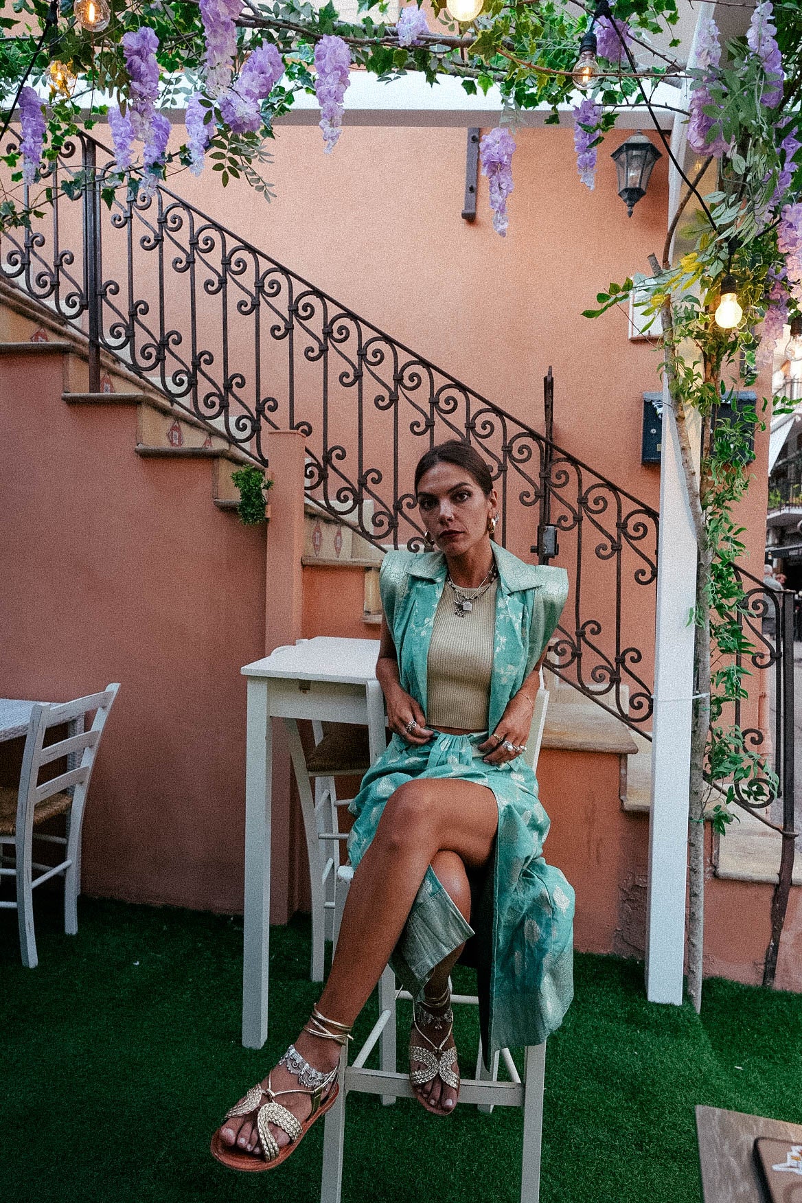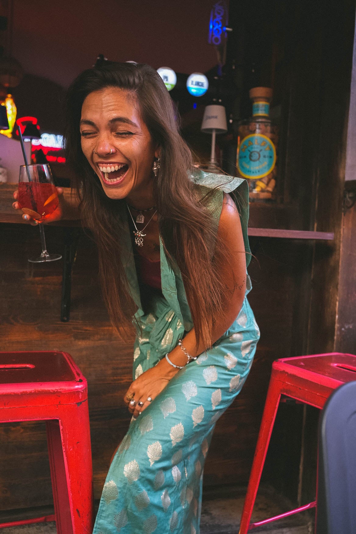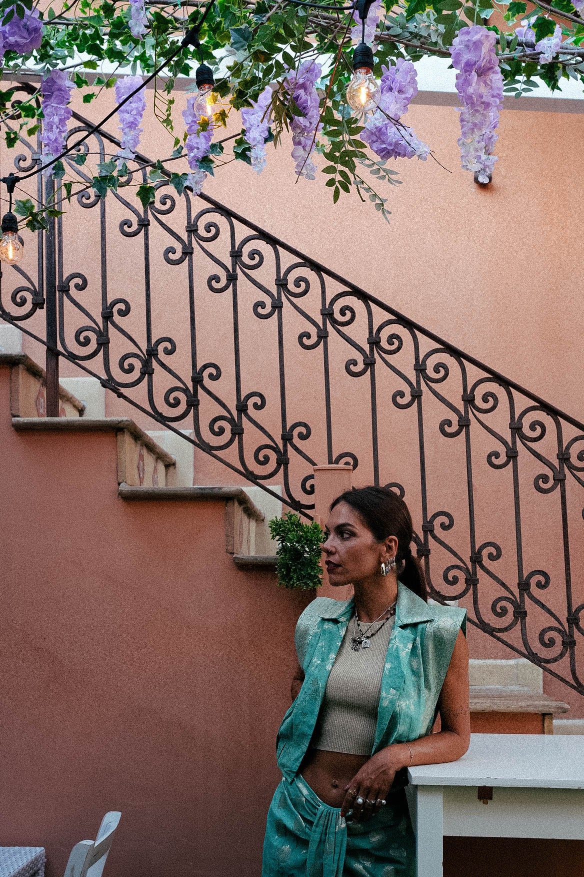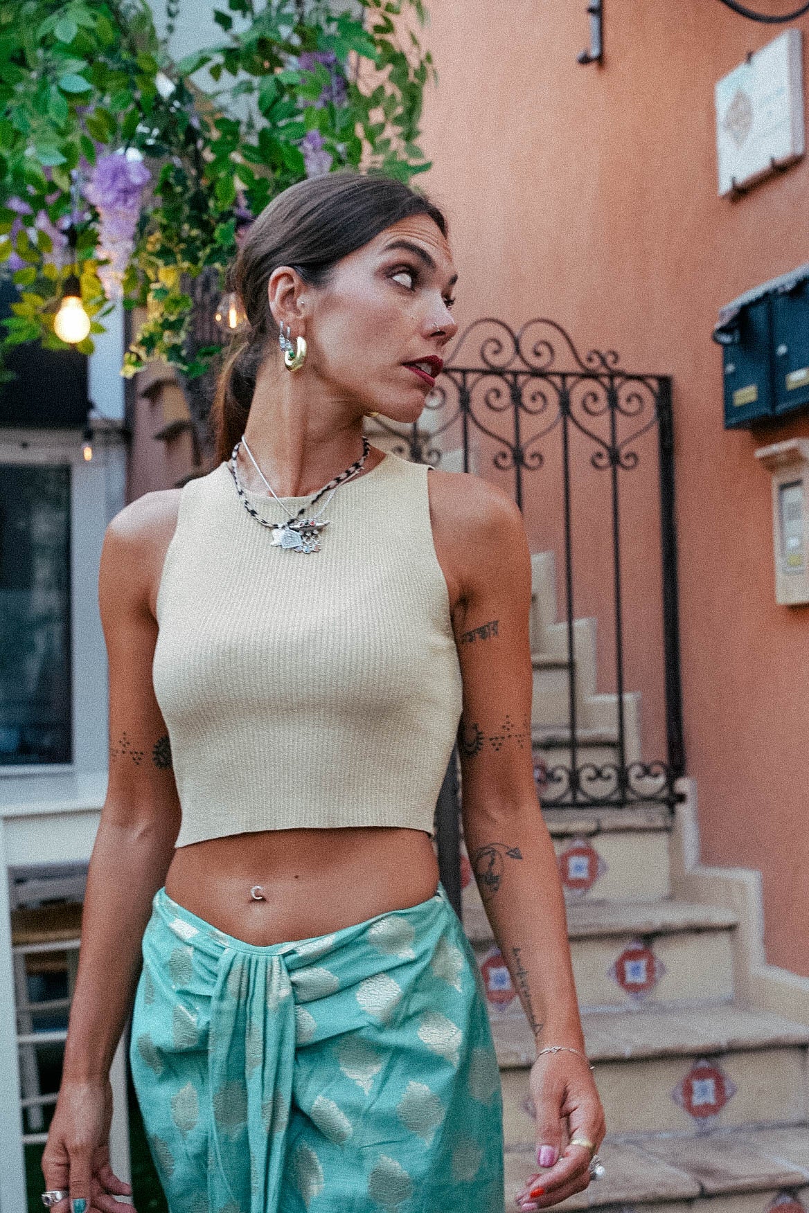La gonna è ispirata ai saree delle donne indiane, con una piccola cascata di tessuto sul davanti che richiama appunto il davanti dei saree, ha uno spacco frontale e si chiude con una zip laterale nascosta.