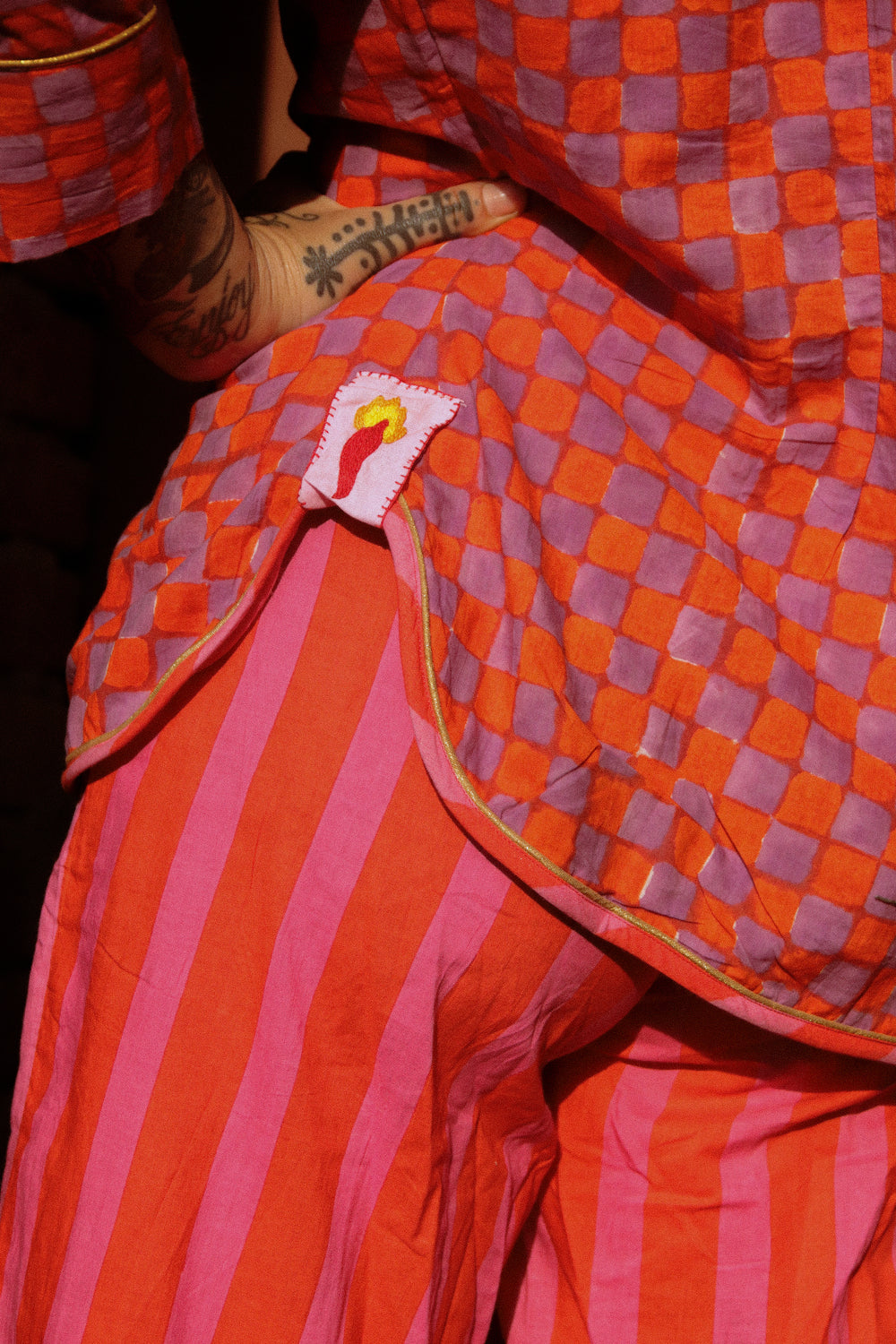 È realizzata in cotone 100% stampato a mano con la tecnica block print e, essendo il tessuto completamente artigianale, potrebbero esserci delle irregolarità nella stampa: è la peculiarità e bellezza del fatto a mano!