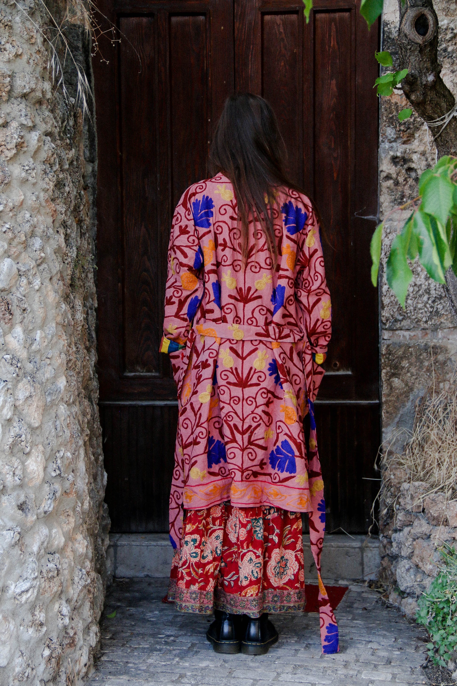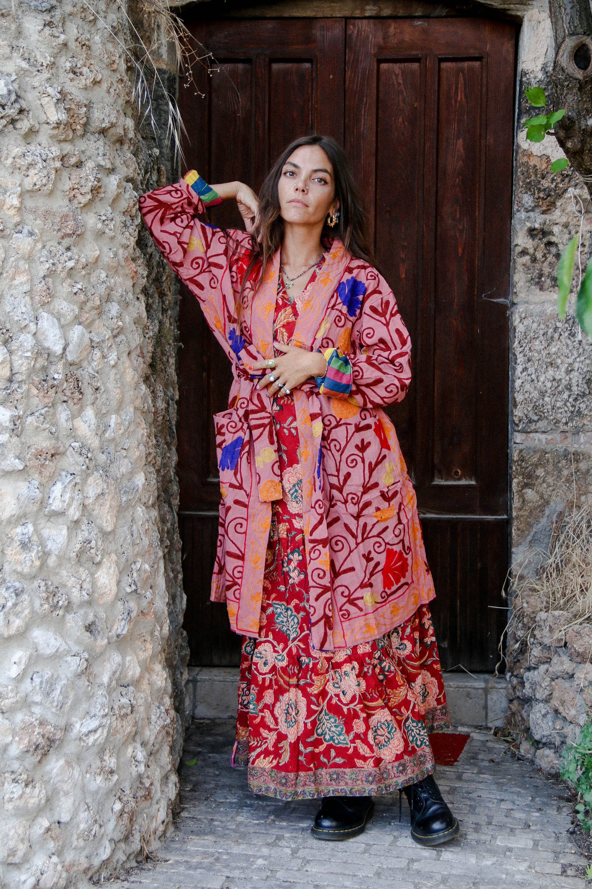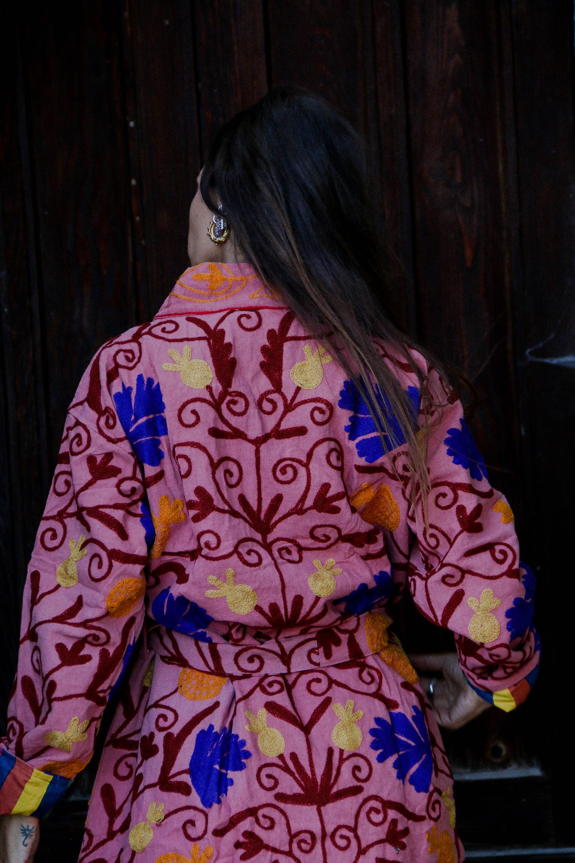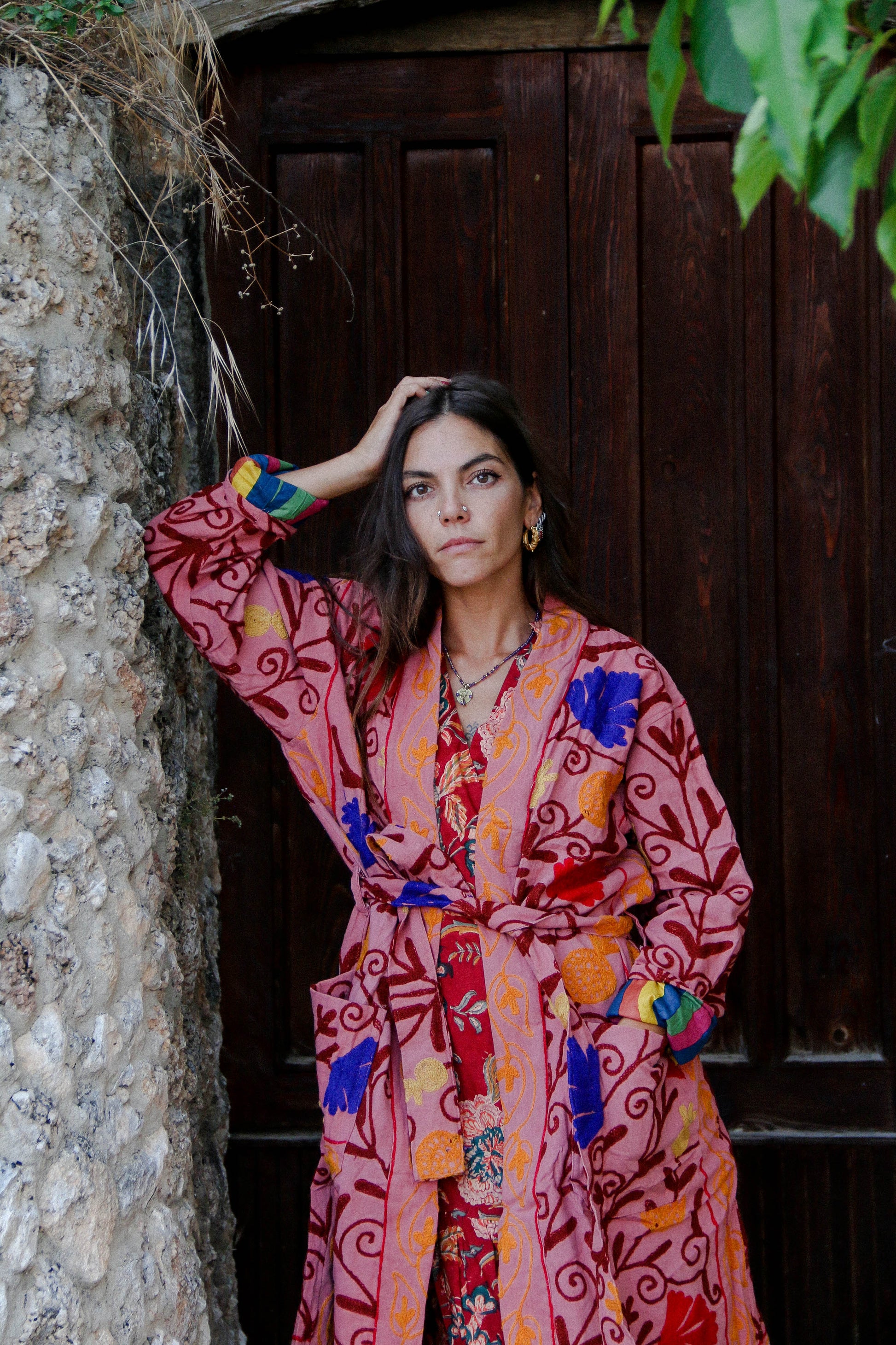 I tessuti che abbiamo utilizzato per creare queste giacche, infatti, sono in realtà dei copriletto: ogni pezzo è unico! La vestibilità è molto comoda, la giacca non prevede bottoni ma una cintura fatta dello stesso tessuto.