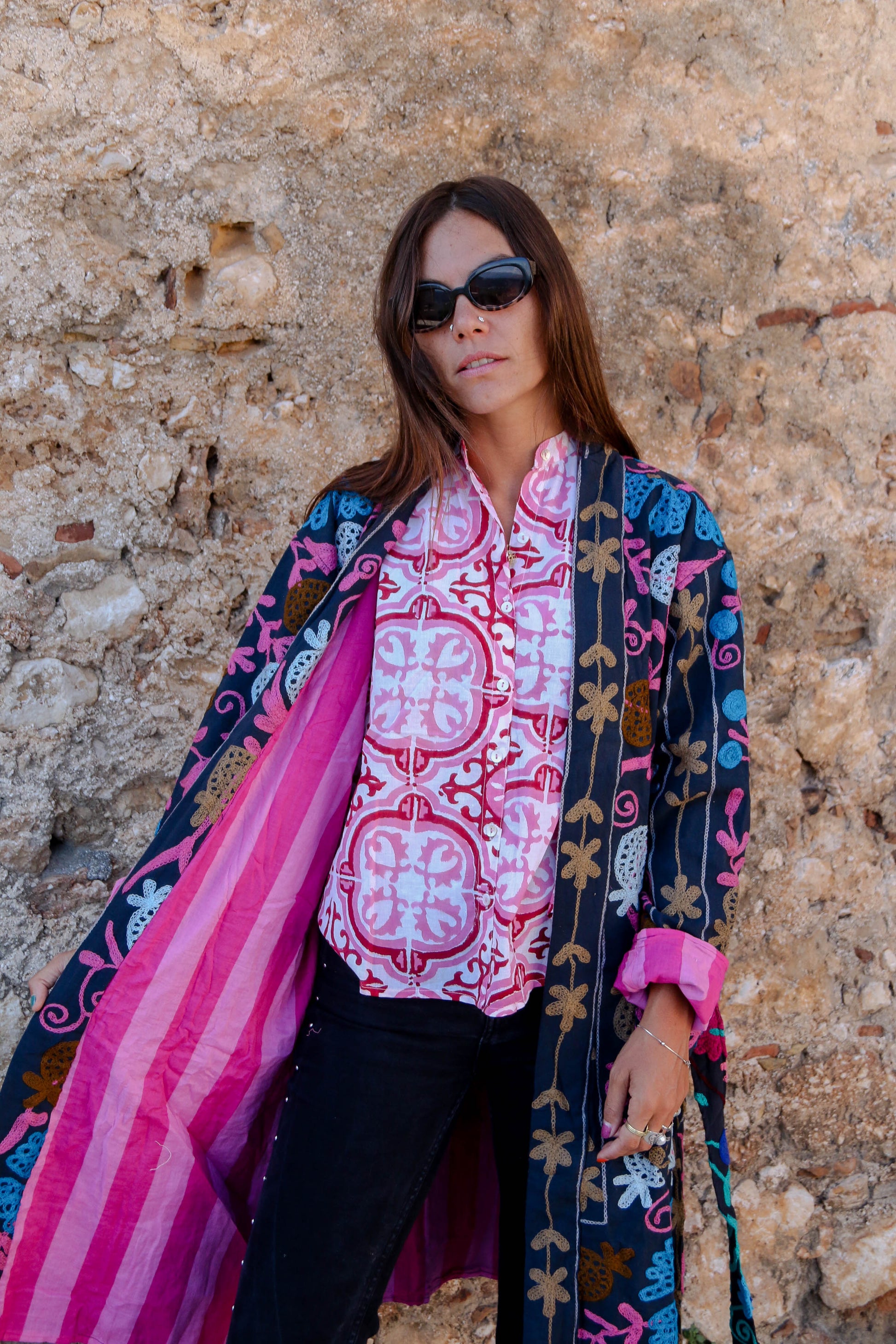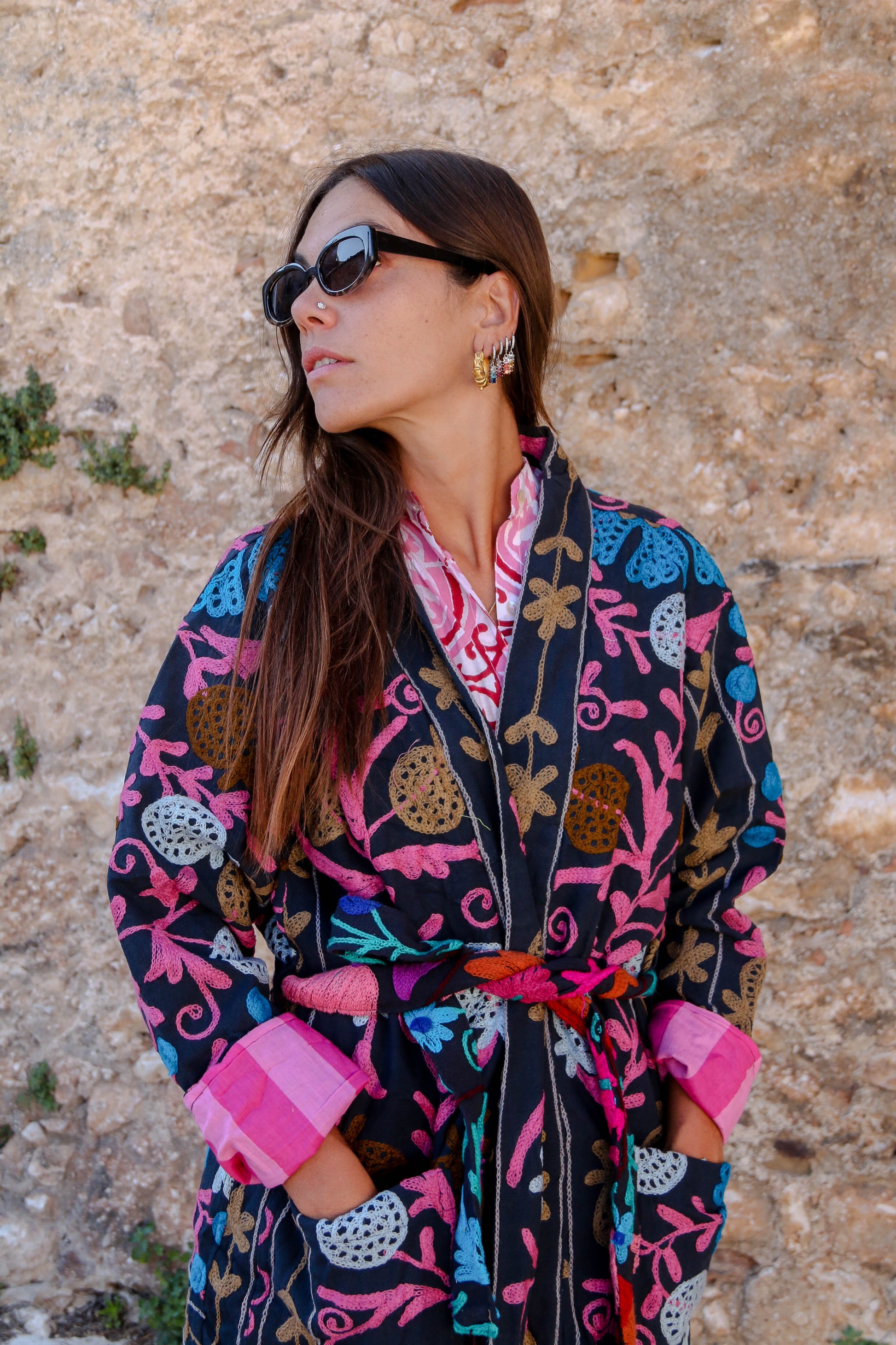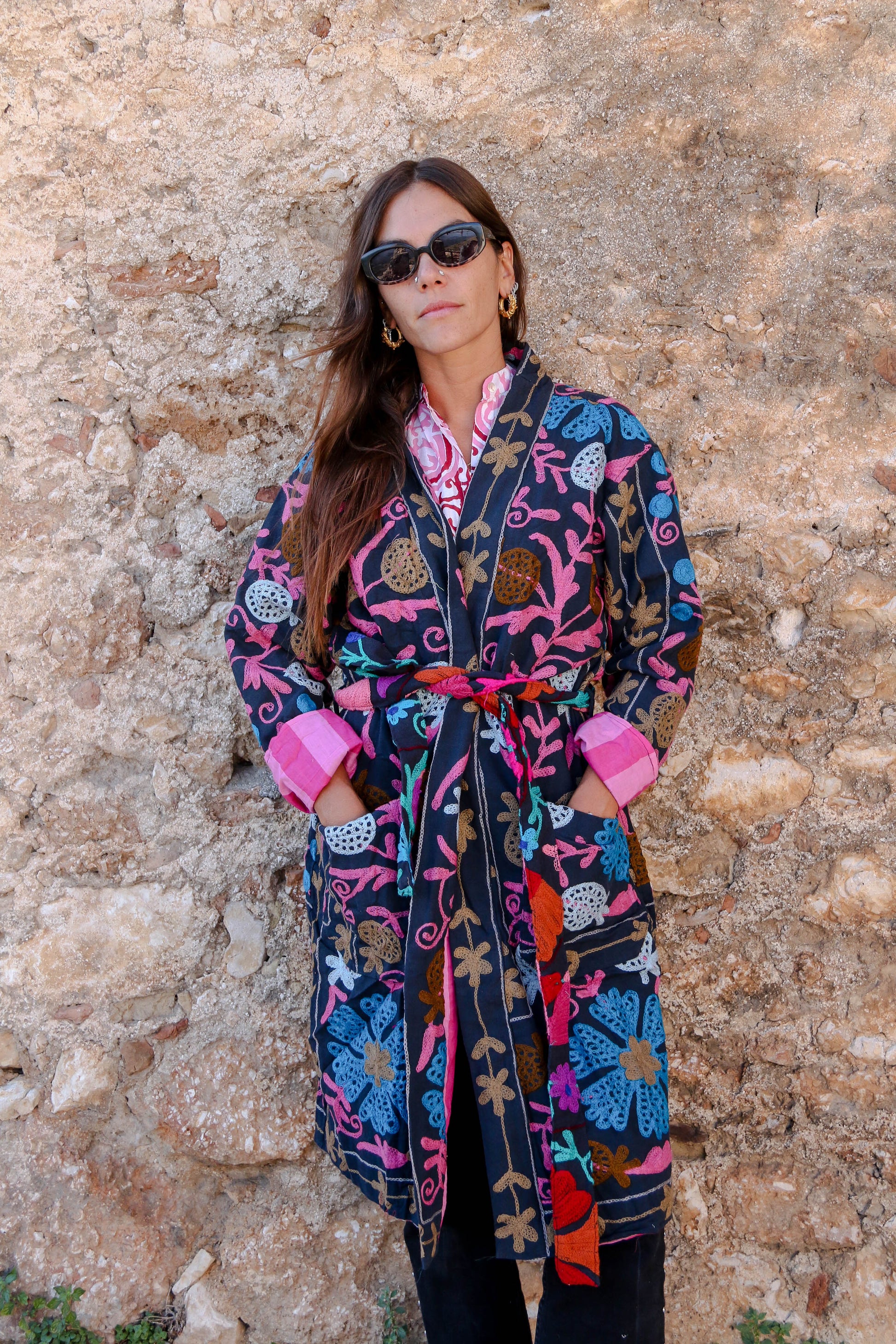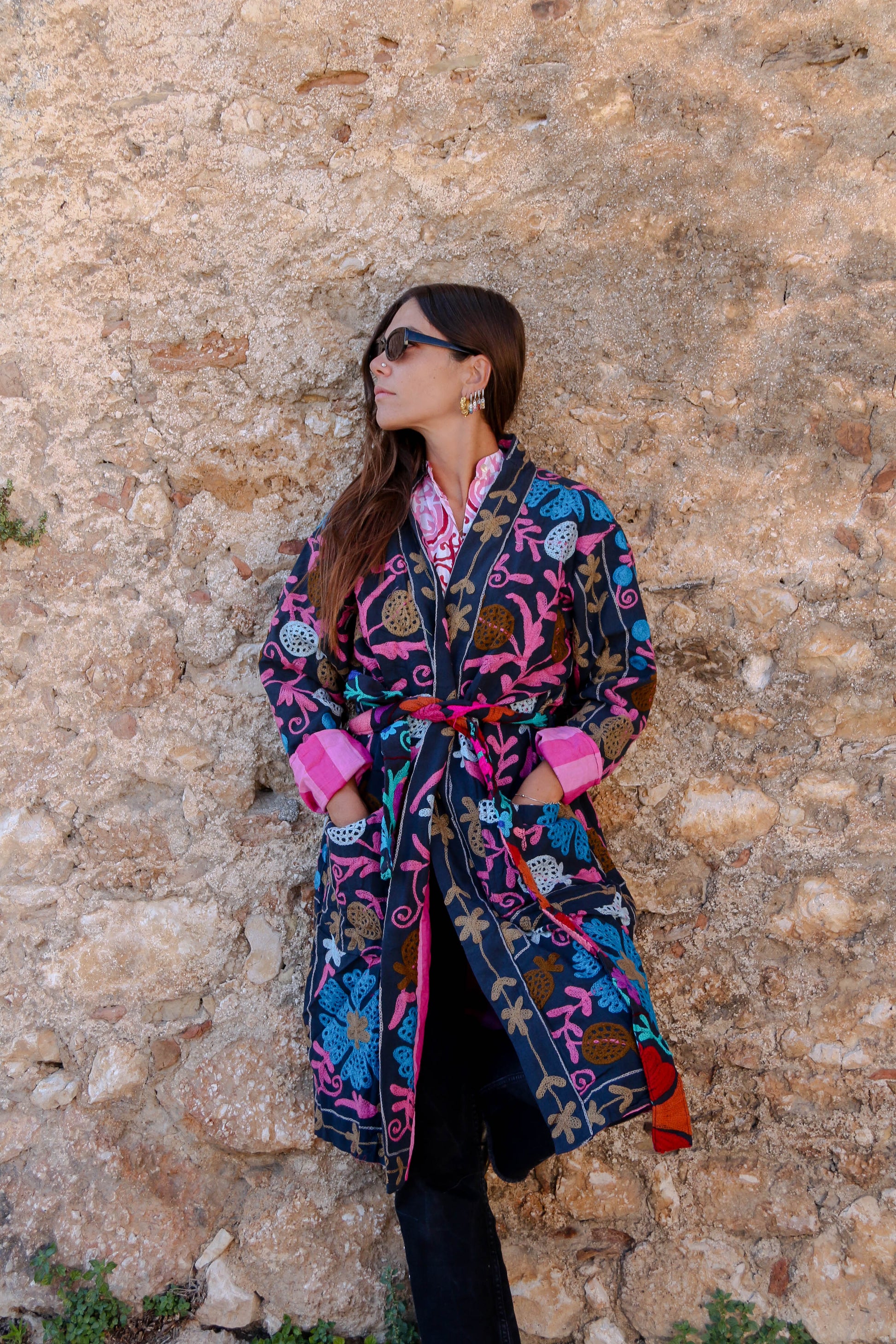 I tessuti che abbiamo utilizzato per creare queste giacche, infatti, sono in realtà dei copriletto: ogni pezzo è unico! La vestibilità è molto comoda, la giacca non prevede bottoni ma una cintura fatta dello stesso tessuto.
