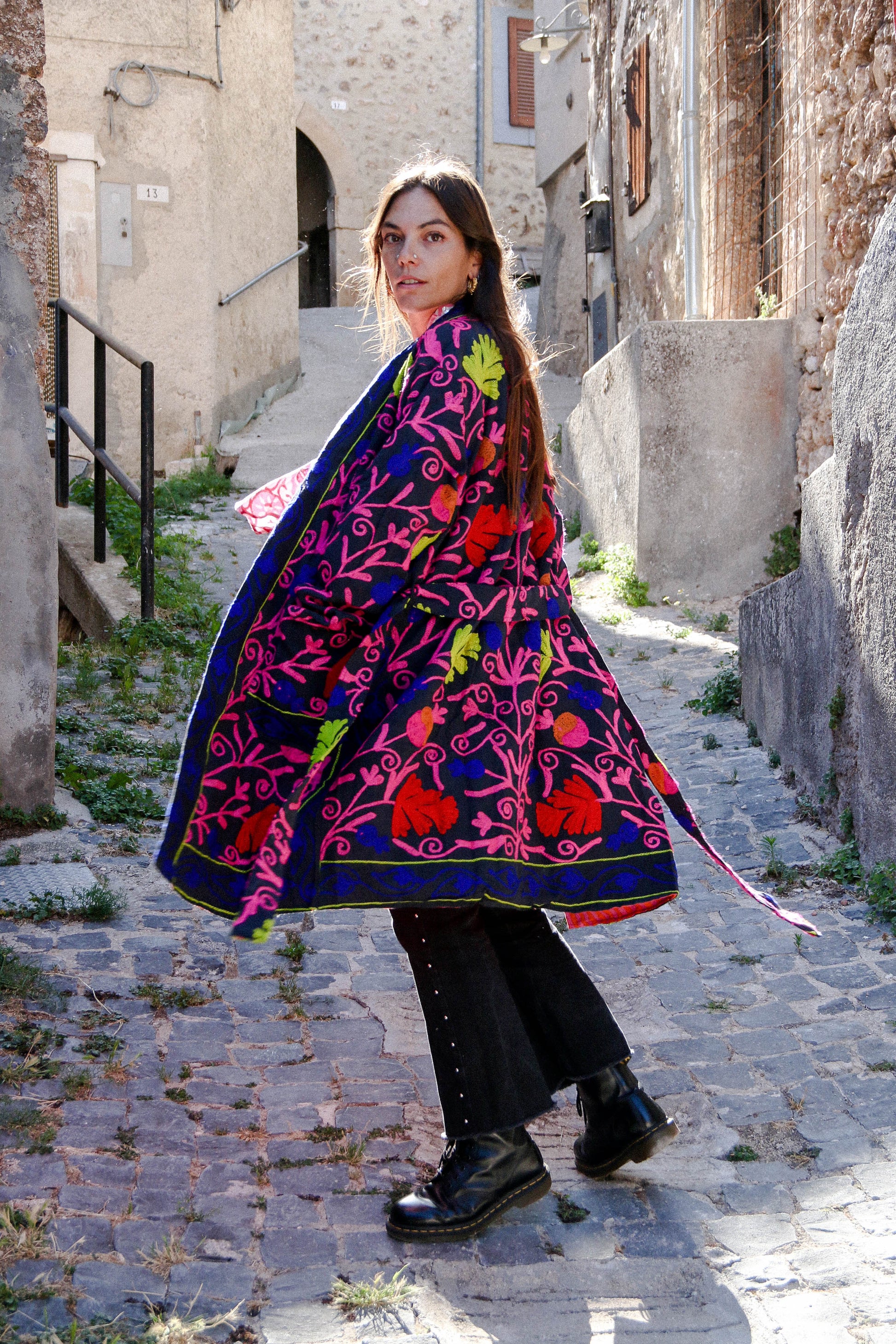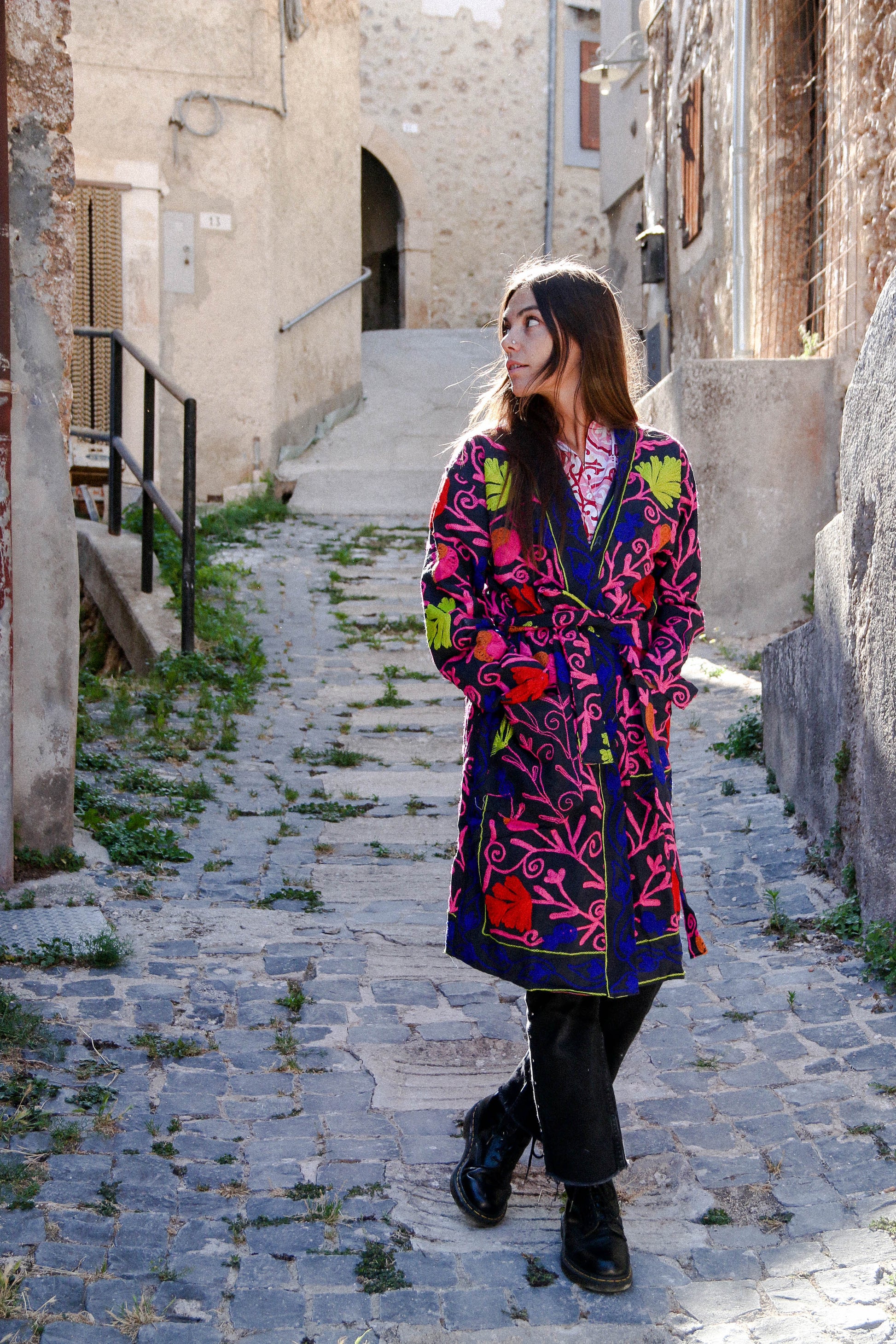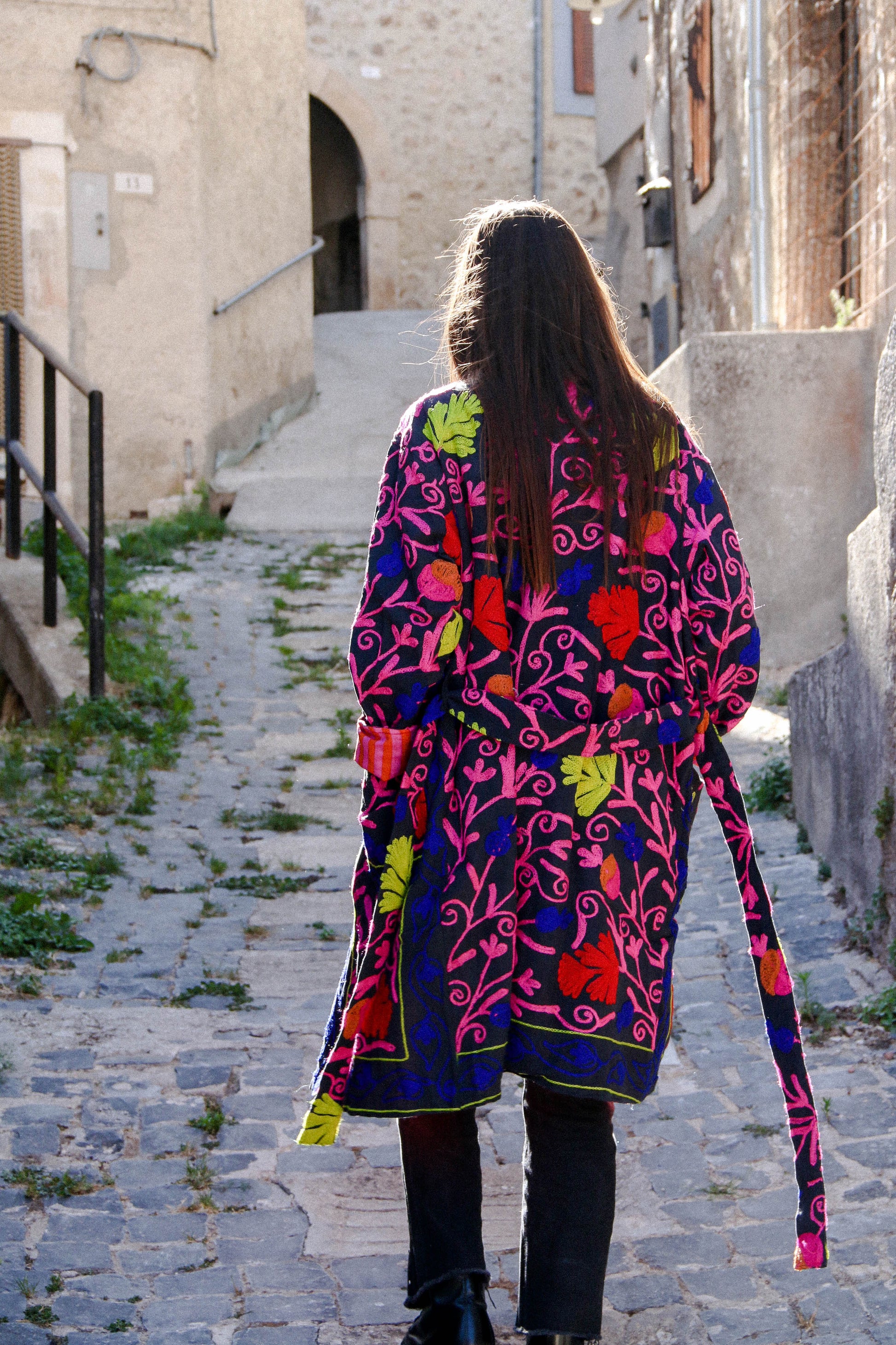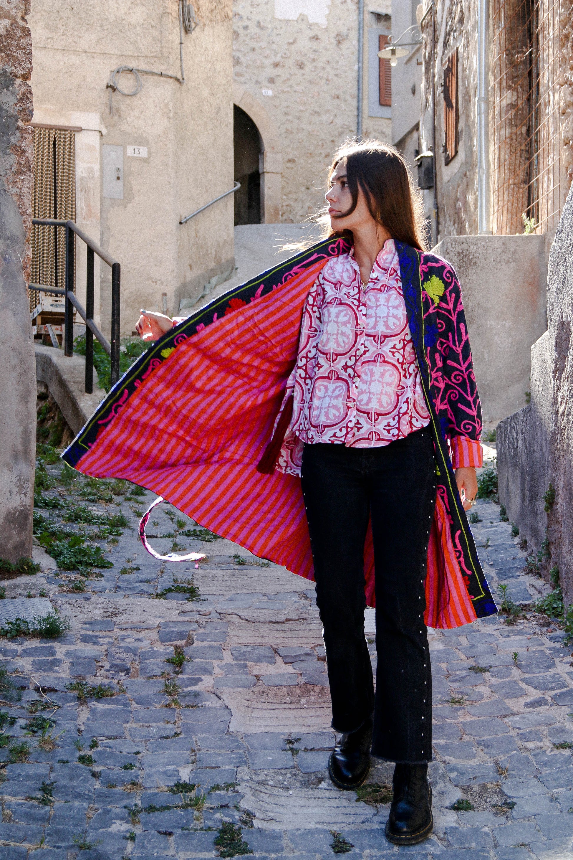 I tessuti che abbiamo utilizzato per creare queste giacche, infatti, sono in realtà dei copriletto: ogni pezzo è unico! La vestibilità è molto comoda, la giacca non prevede bottoni ma una cintura fatta dello stesso tessuto.