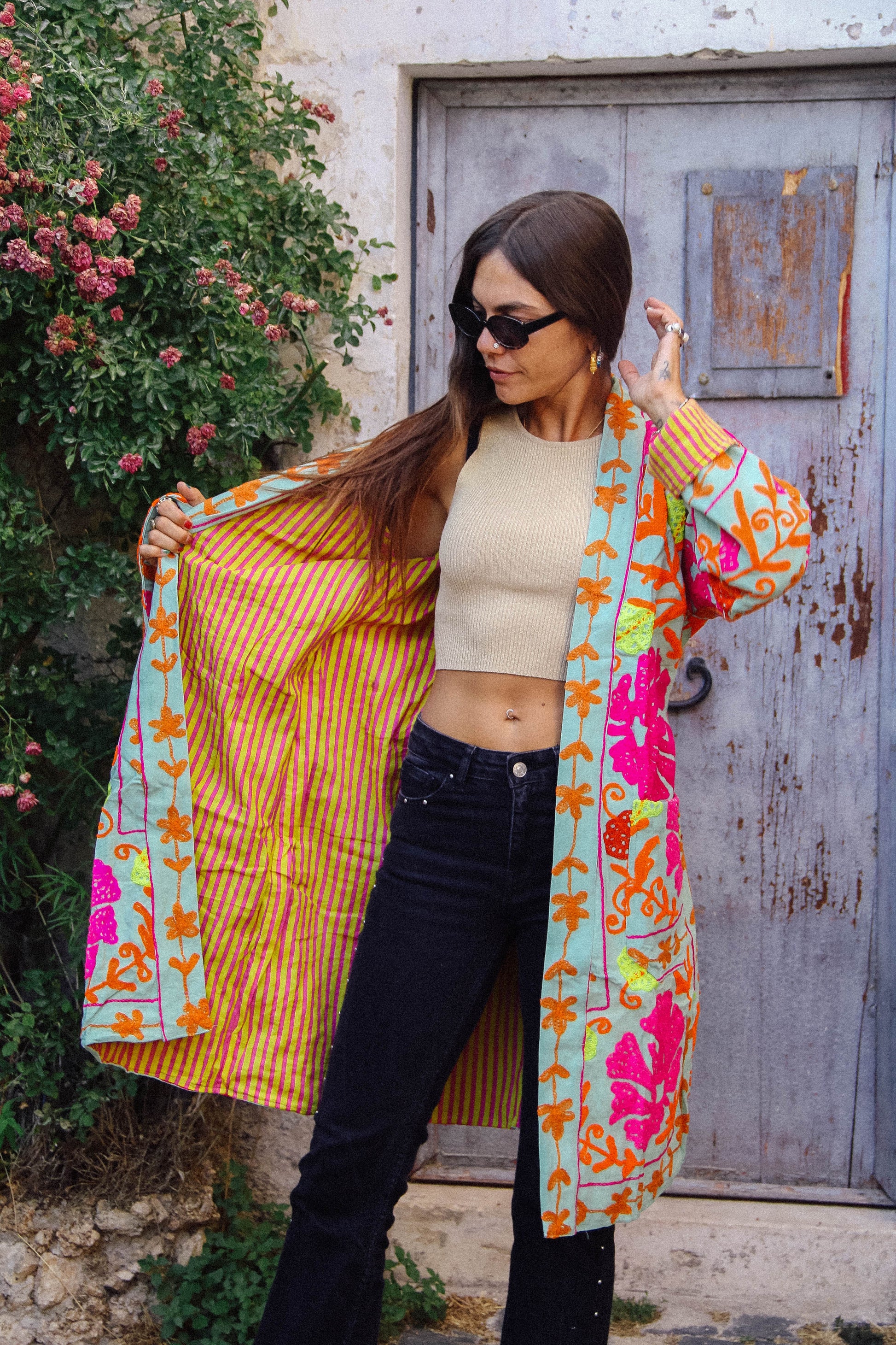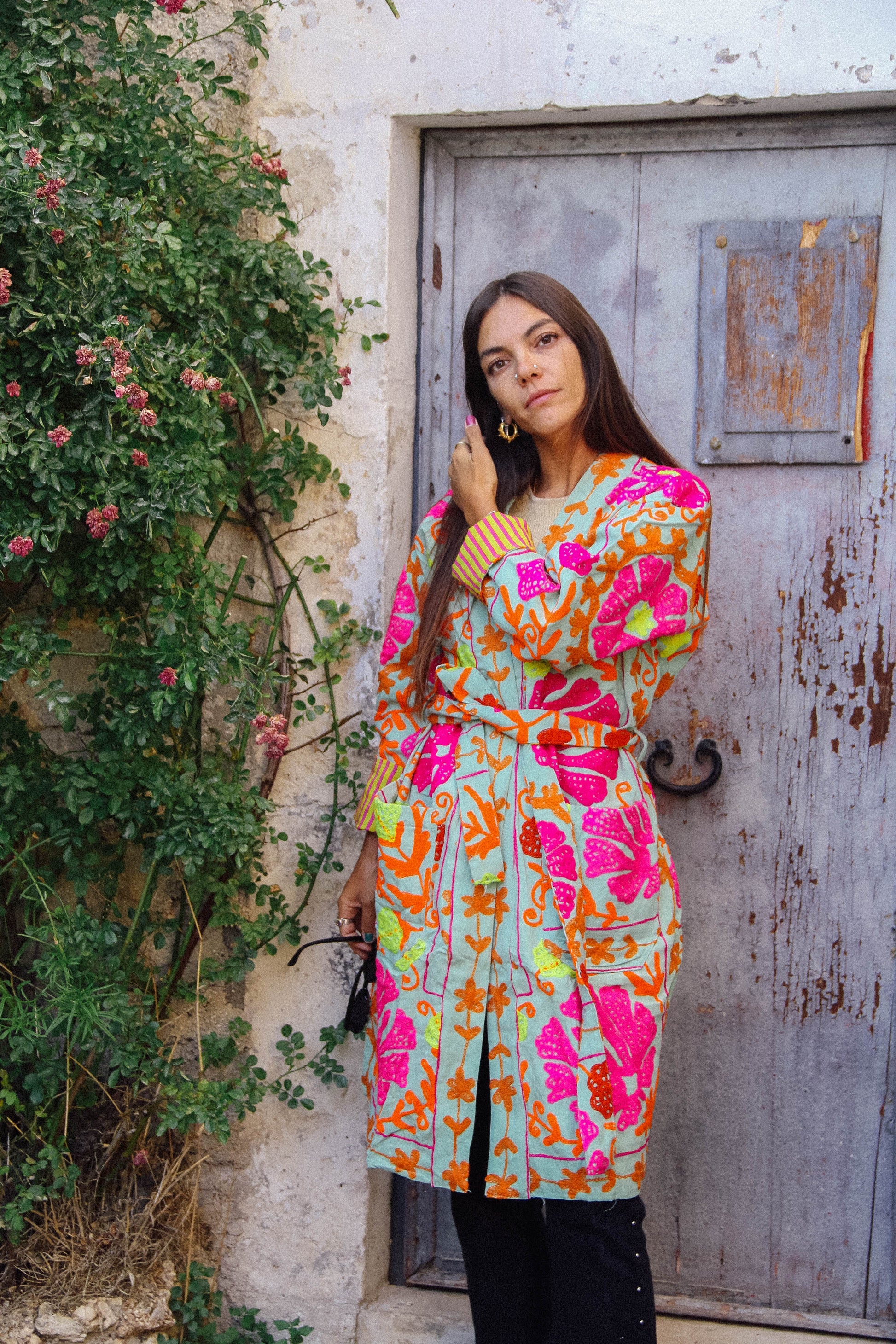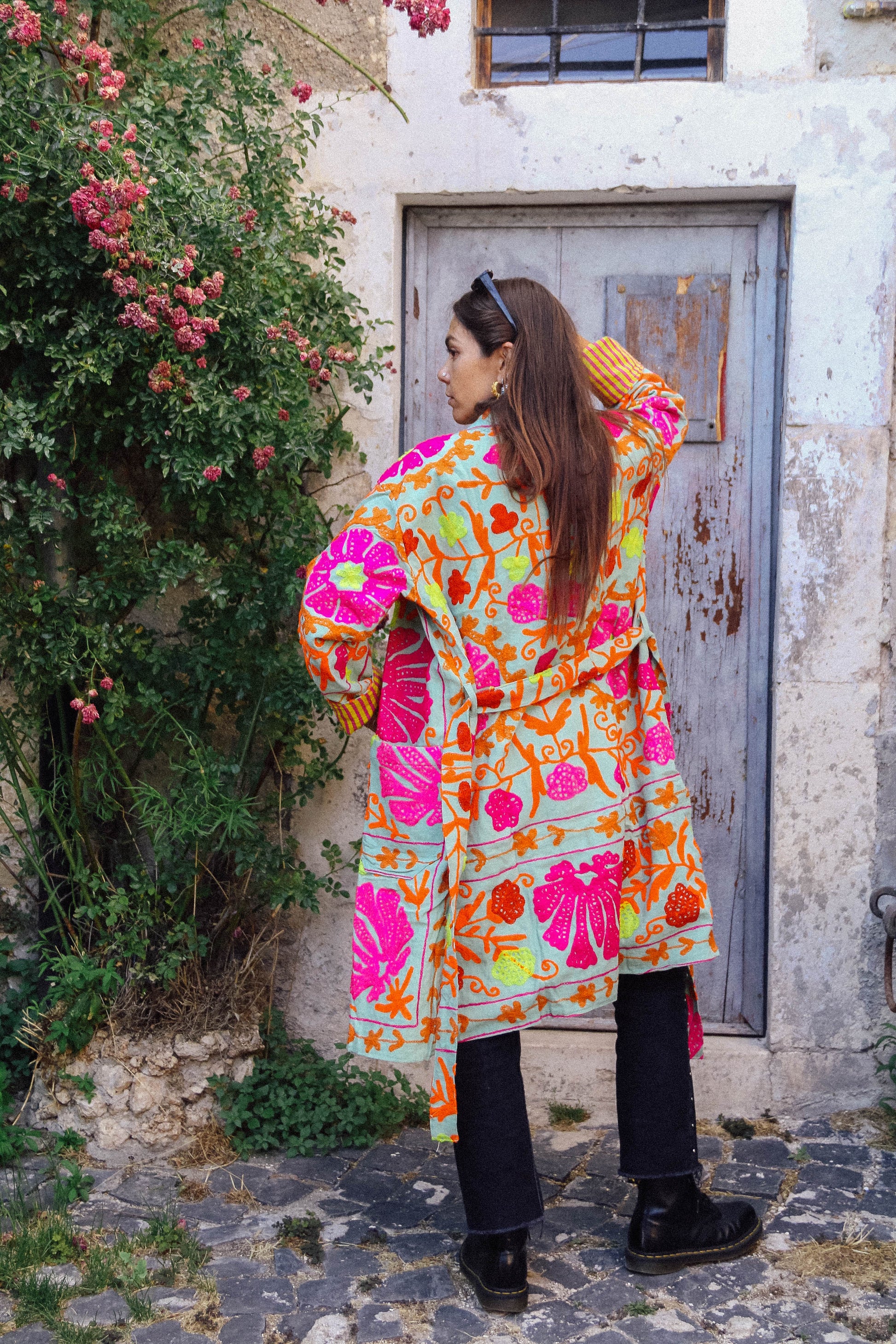 I tessuti che abbiamo utilizzato per creare queste giacche, infatti, sono in realtà dei copriletto: ogni pezzo è unico! La vestibilità è molto comoda, la giacca non prevede bottoni ma una cintura fatta dello stesso tessuto.