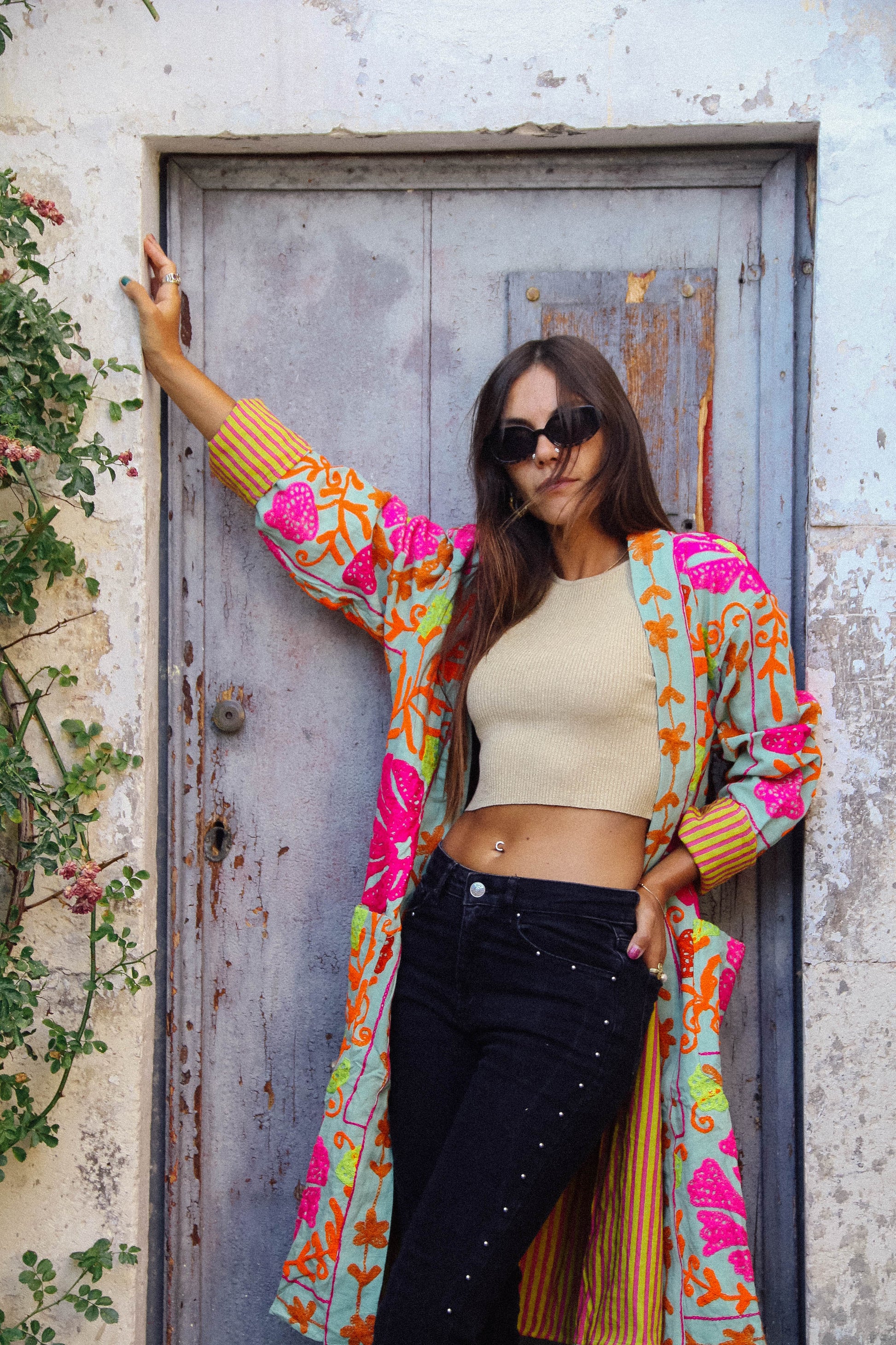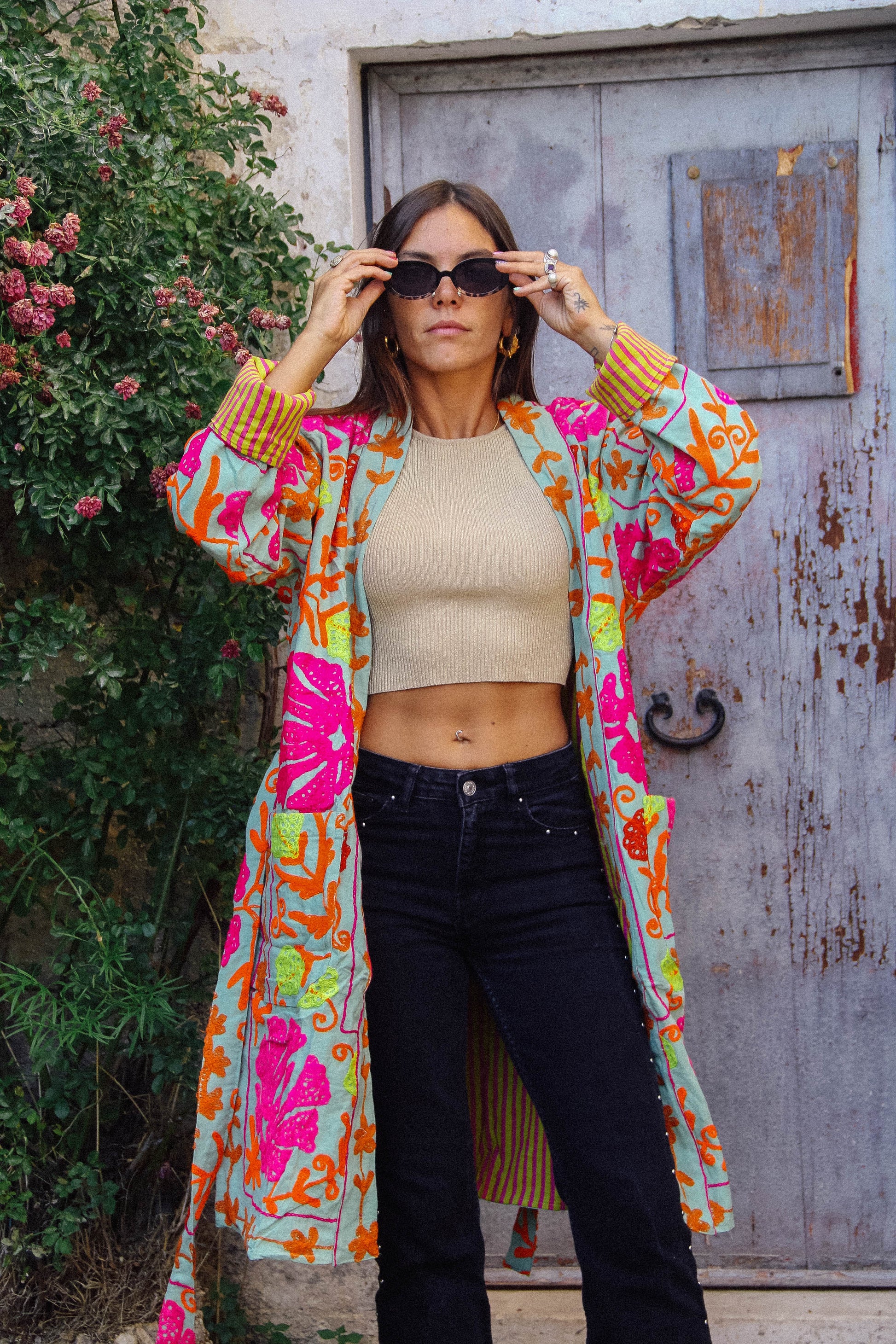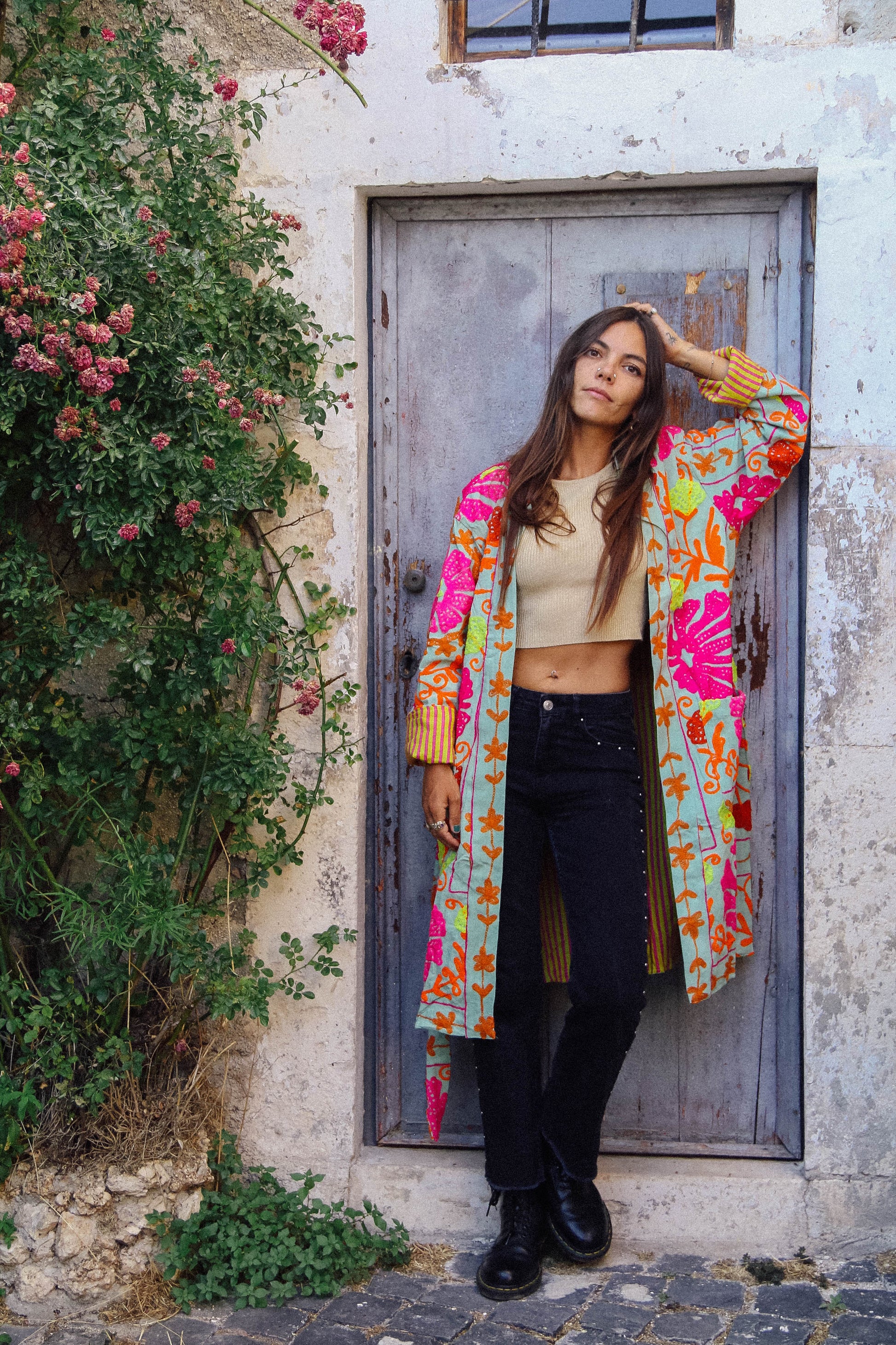 I tessuti che abbiamo utilizzato per creare queste giacche, infatti, sono in realtà dei copriletto: ogni pezzo è unico! La vestibilità è molto comoda, la giacca non prevede bottoni ma una cintura fatta dello stesso tessuto.