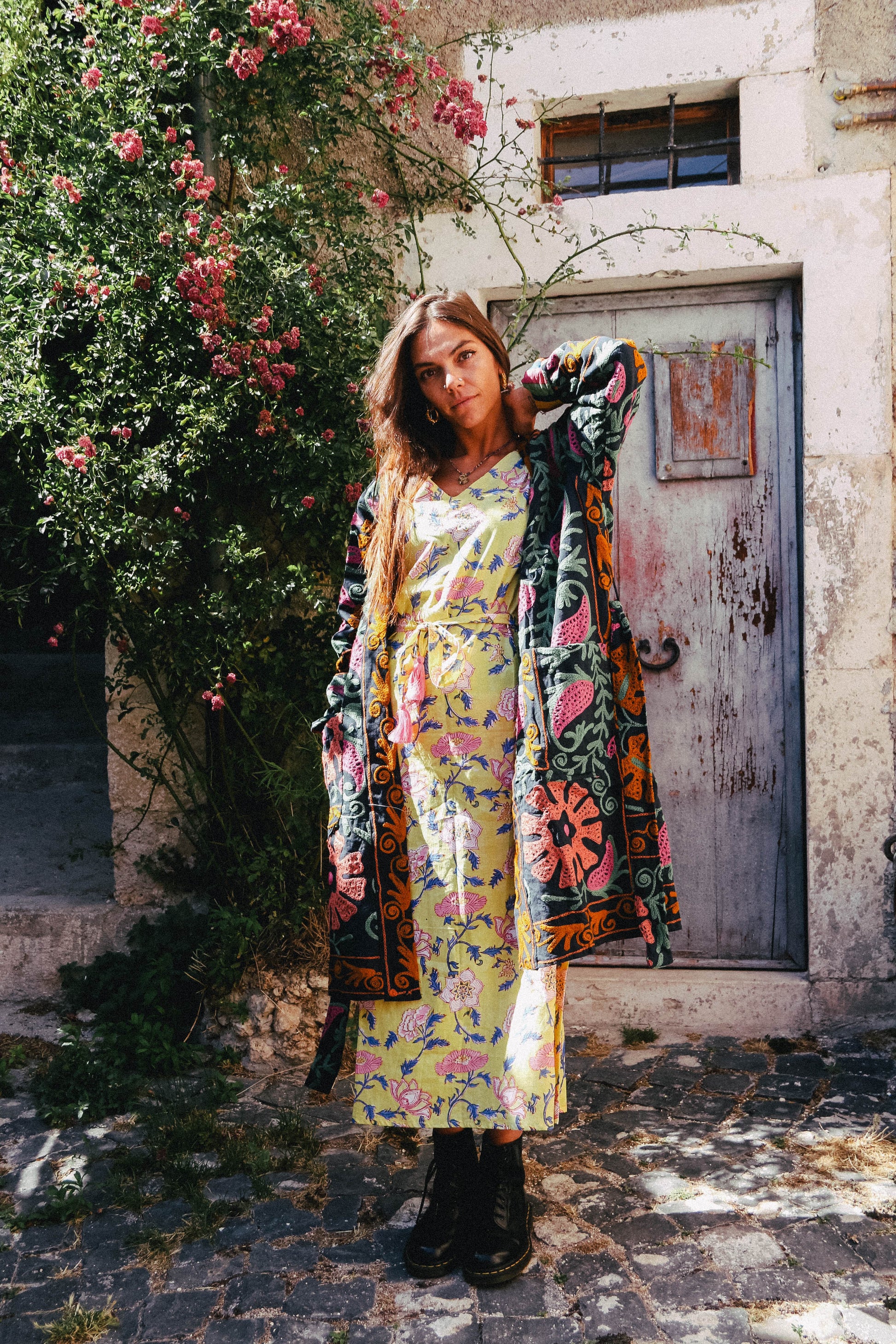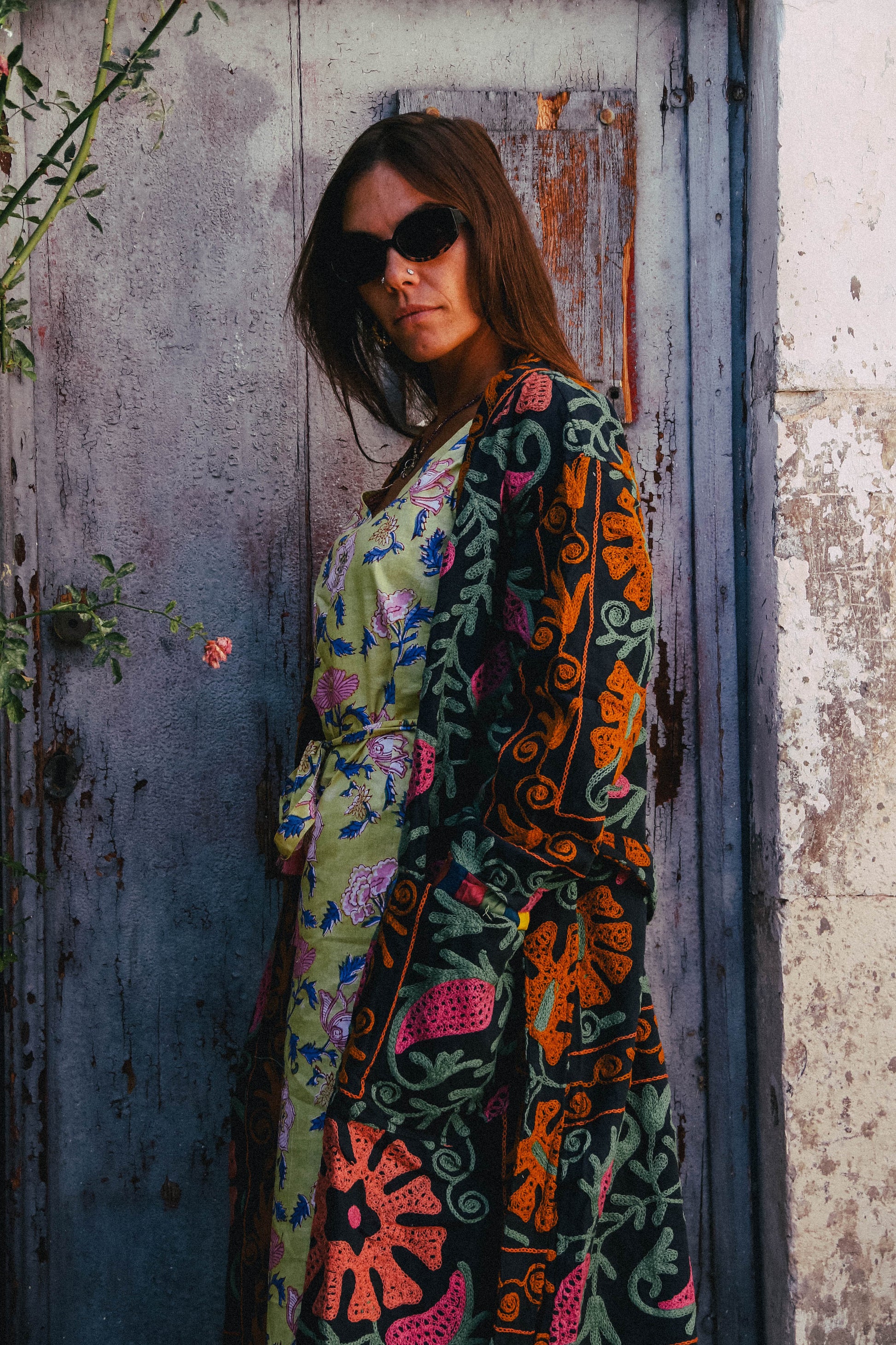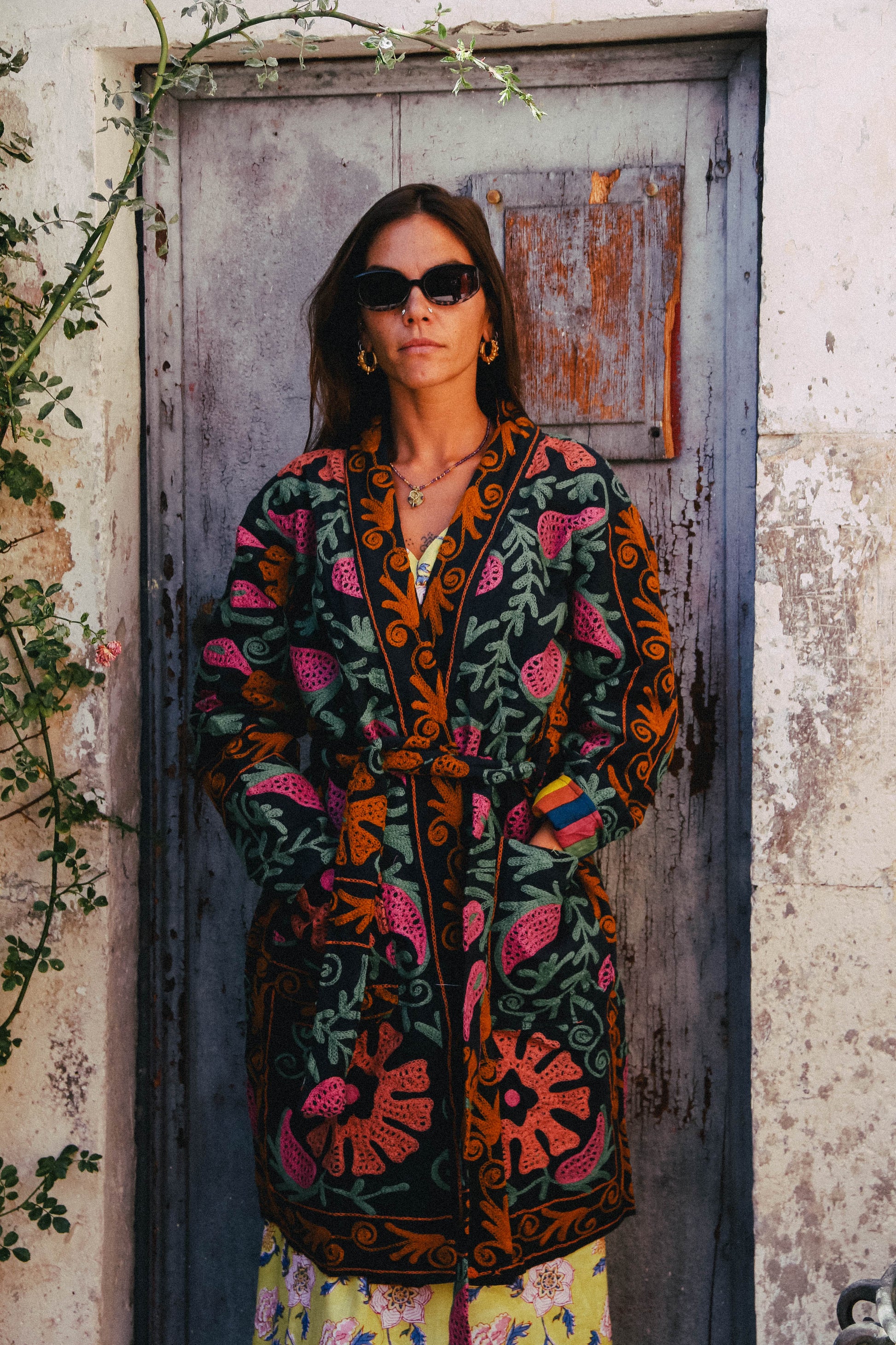 I tessuti che abbiamo utilizzato per creare queste giacche, infatti, sono in realtà dei copriletto: ogni pezzo è unico! La vestibilità è molto comoda, la giacca non prevede bottoni ma una cintura fatta dello stesso tessuto.