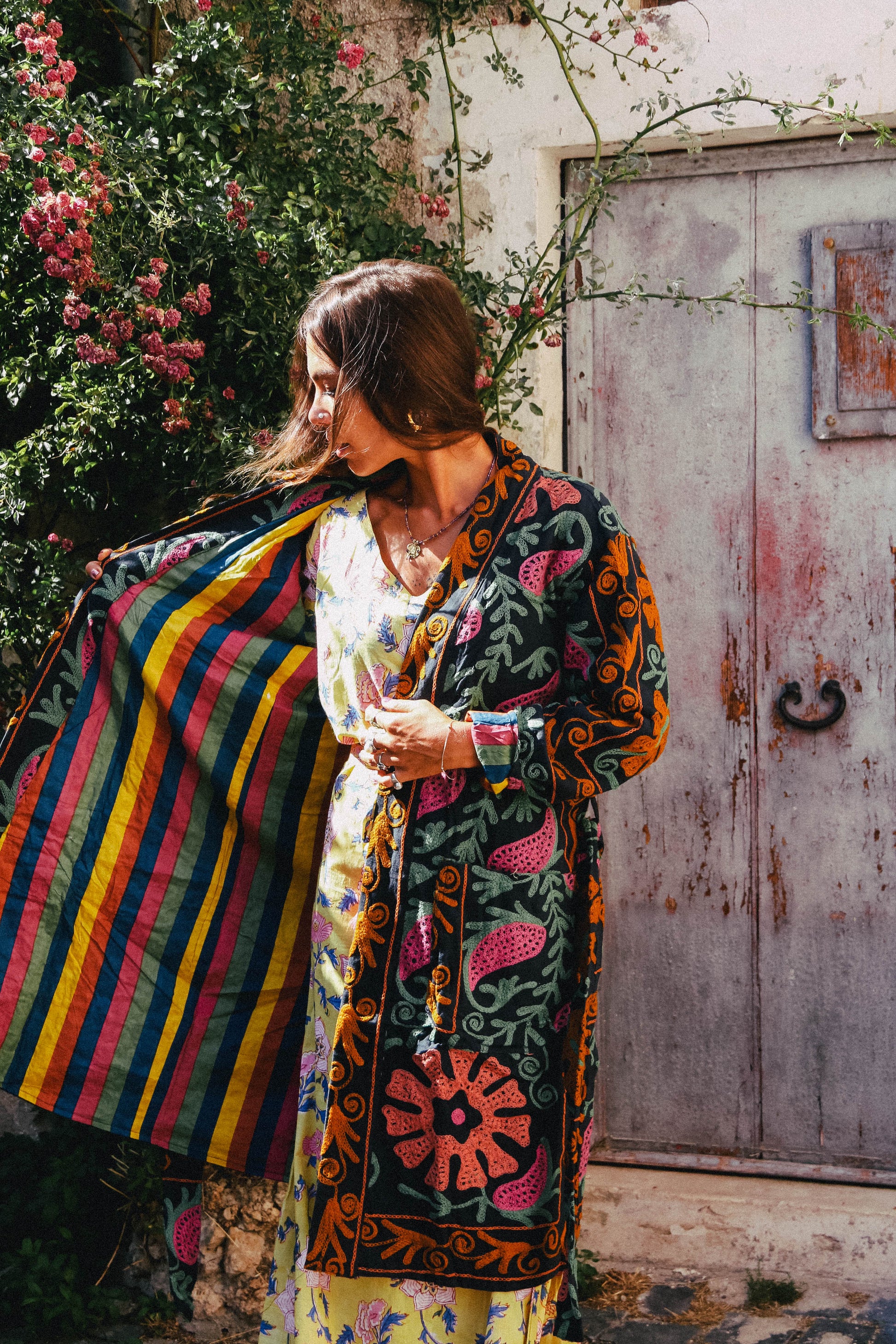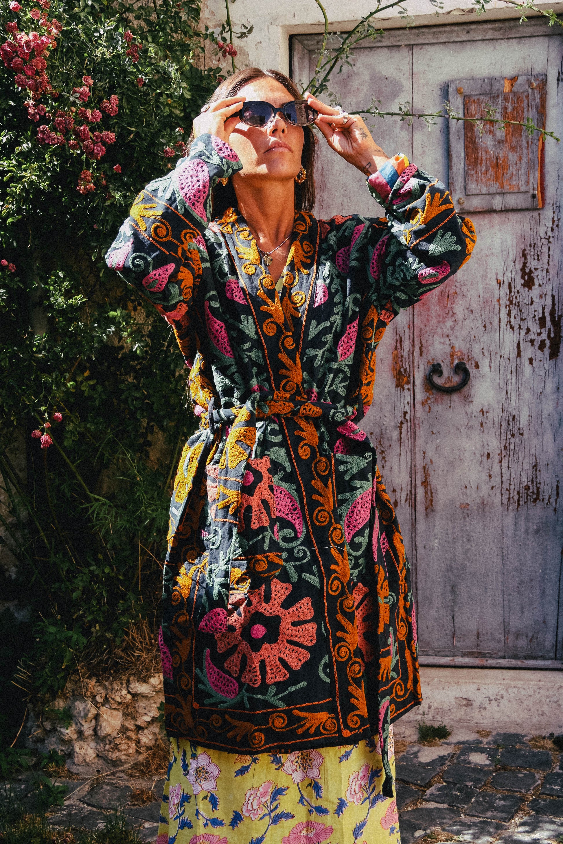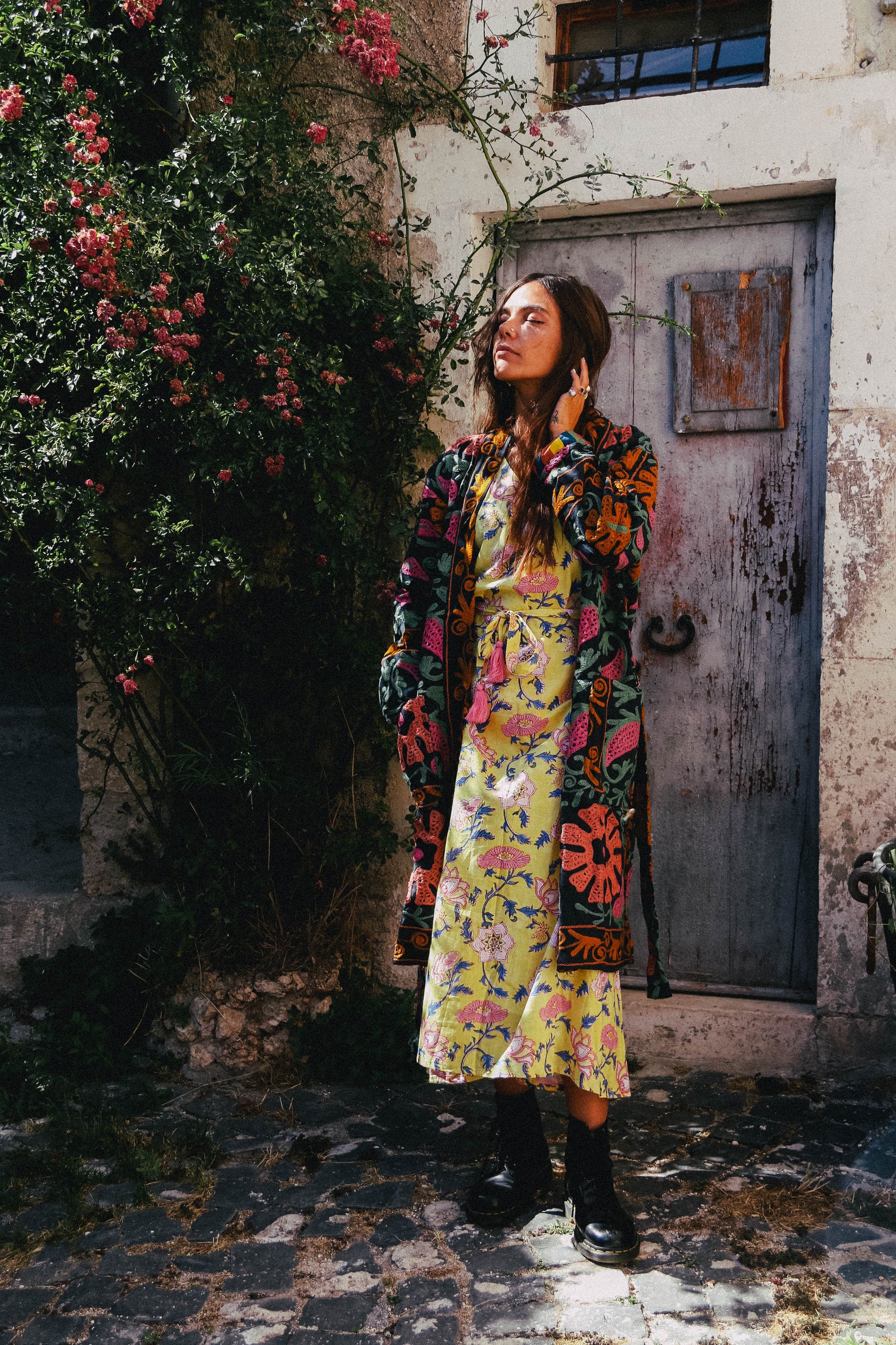 I tessuti che abbiamo utilizzato per creare queste giacche, infatti, sono in realtà dei copriletto: ogni pezzo è unico! La vestibilità è molto comoda, la giacca non prevede bottoni ma una cintura fatta dello stesso tessuto.