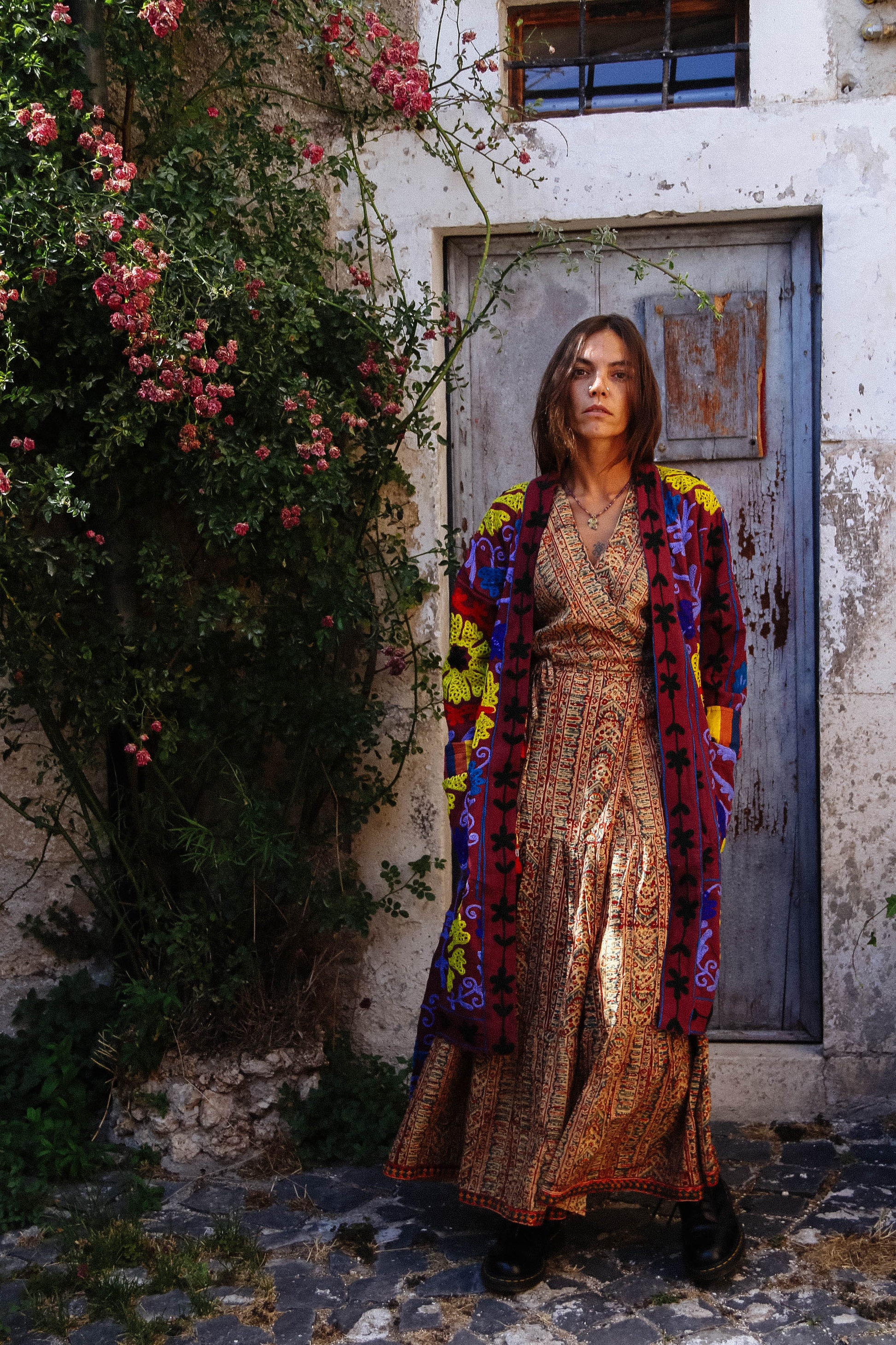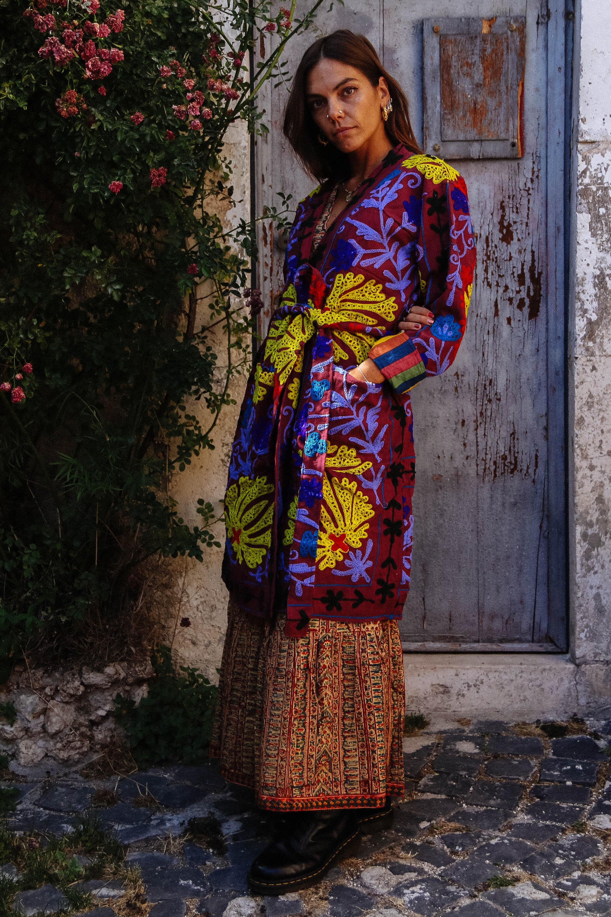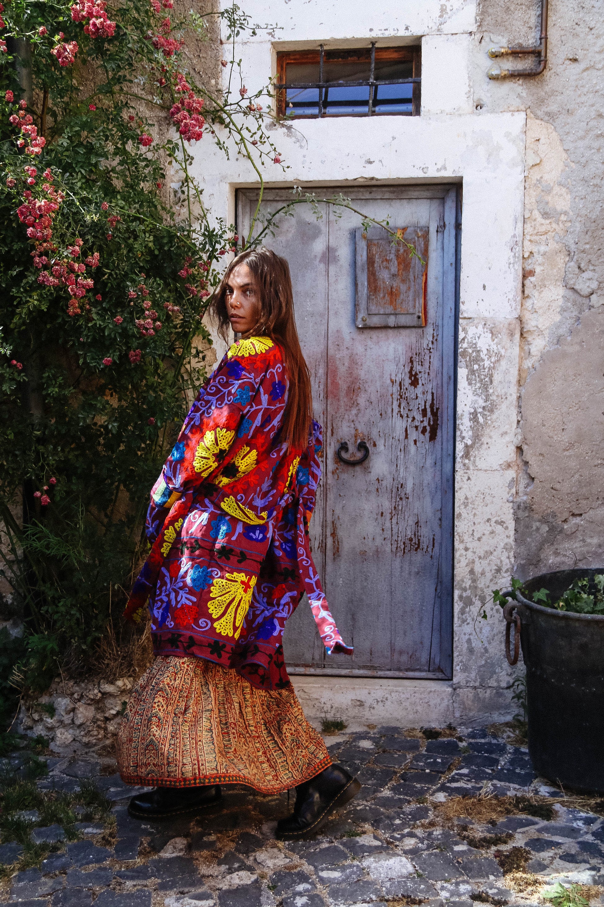 I tessuti che abbiamo utilizzato per creare queste giacche, infatti, sono in realtà dei copriletto: ogni pezzo è unico! La vestibilità è molto comoda, la giacca non prevede bottoni ma una cintura fatta dello stesso tessuto.