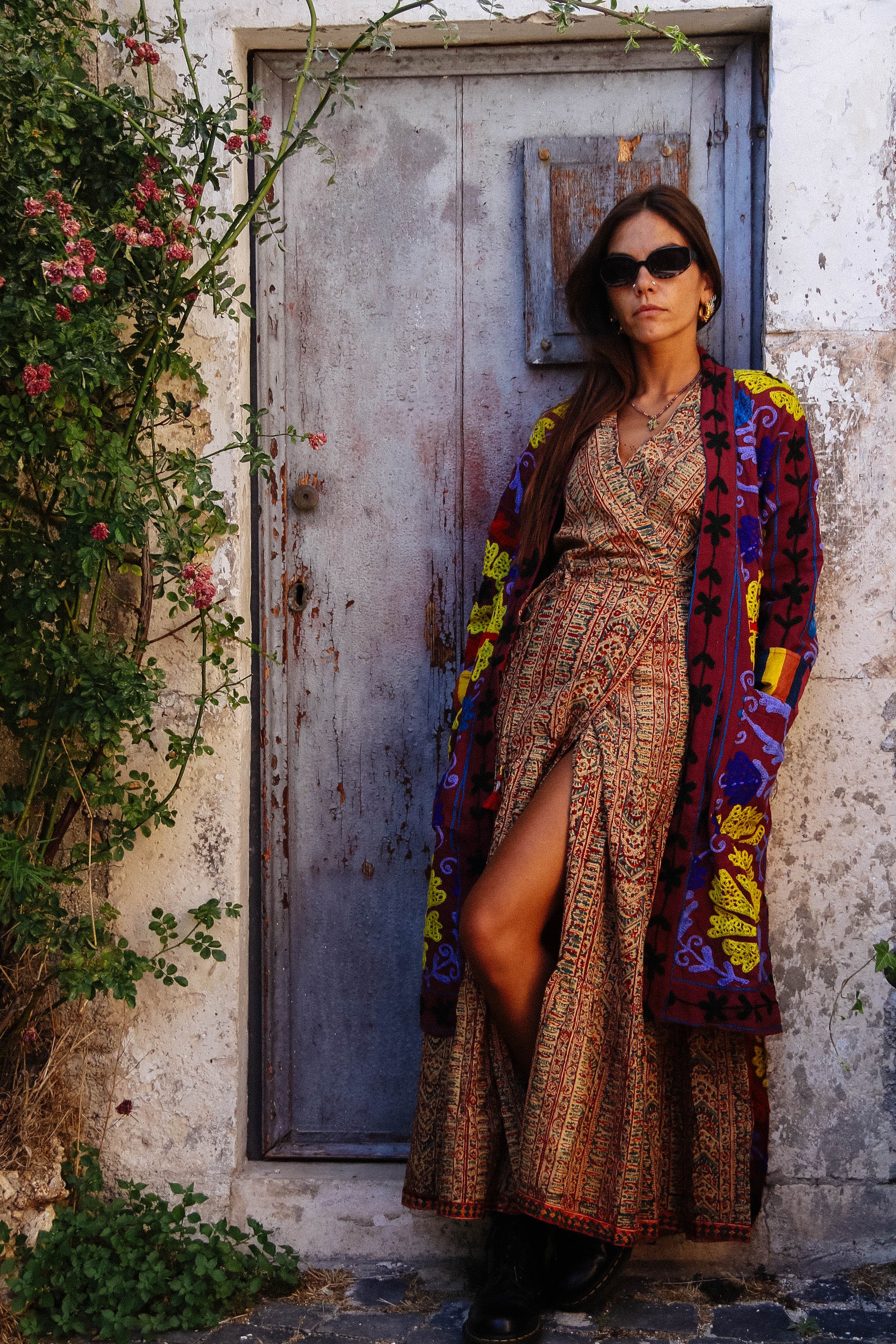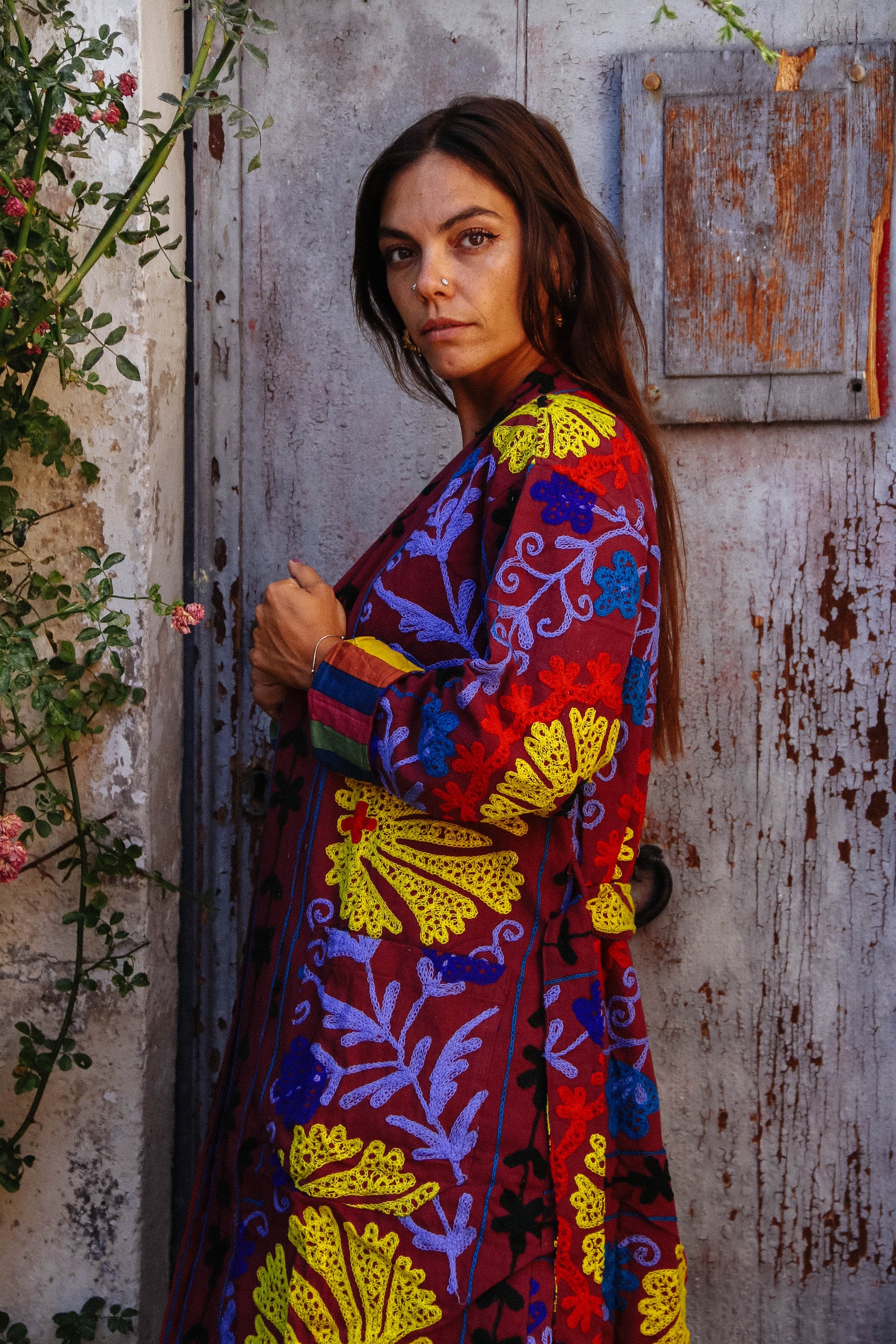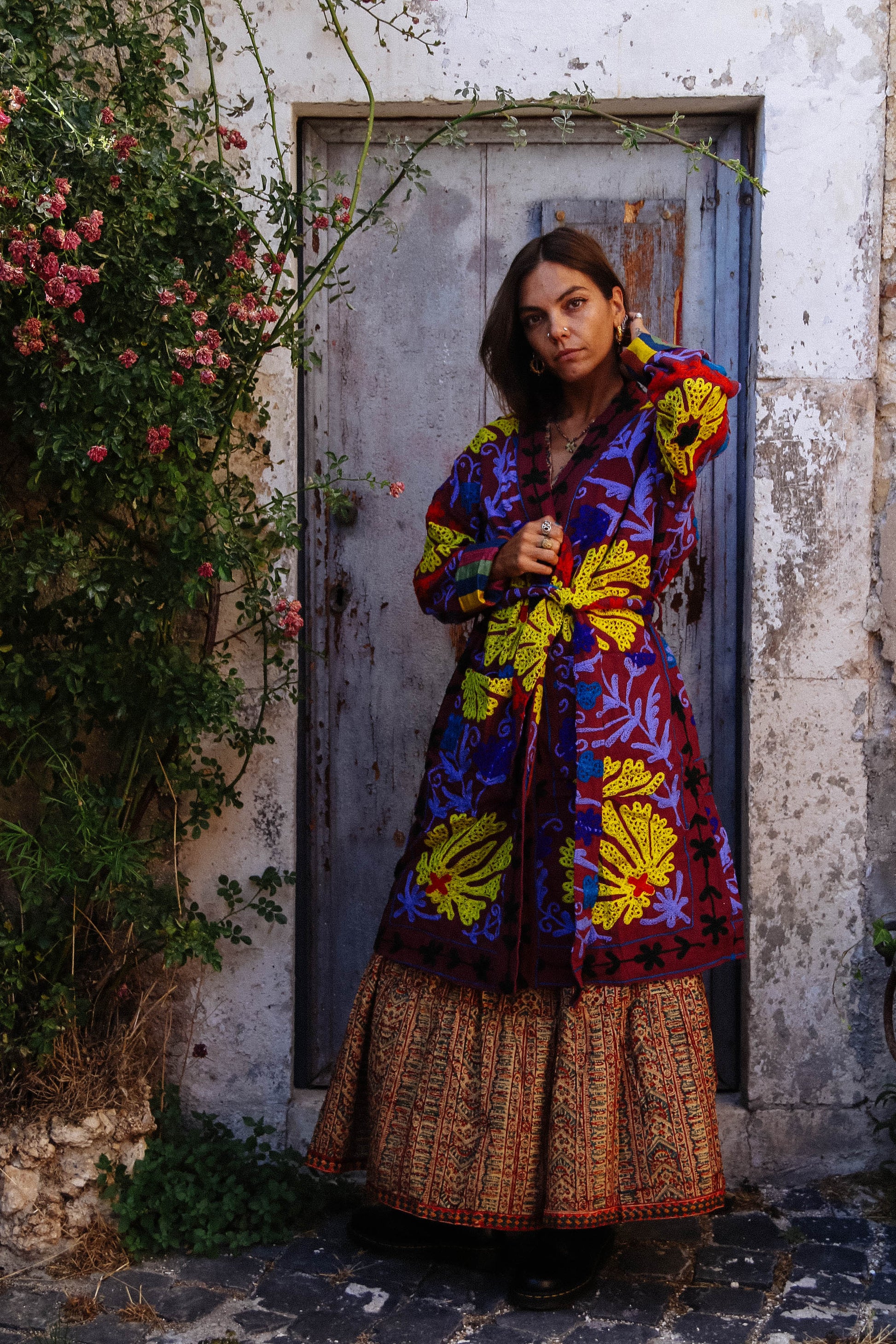 I tessuti che abbiamo utilizzato per creare queste giacche, infatti, sono in realtà dei copriletto: ogni pezzo è unico! La vestibilità è molto comoda, la giacca non prevede bottoni ma una cintura fatta dello stesso tessuto.