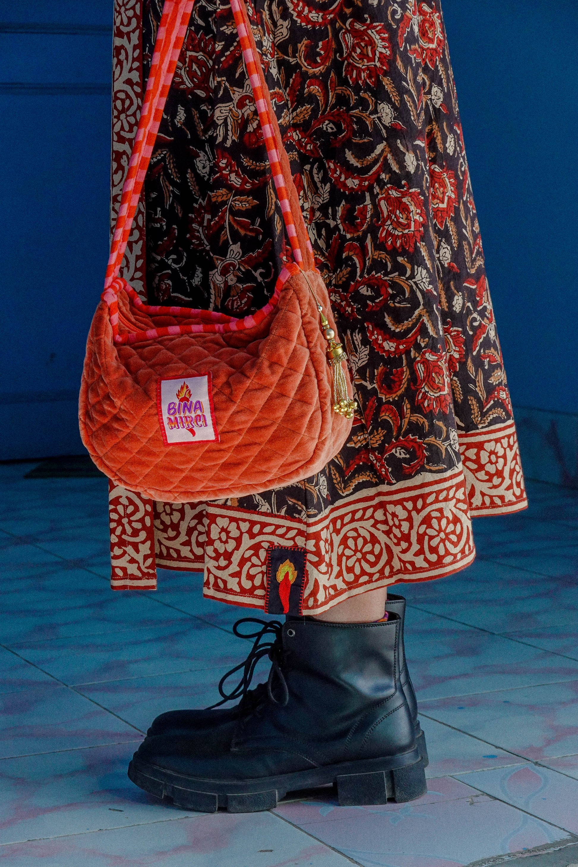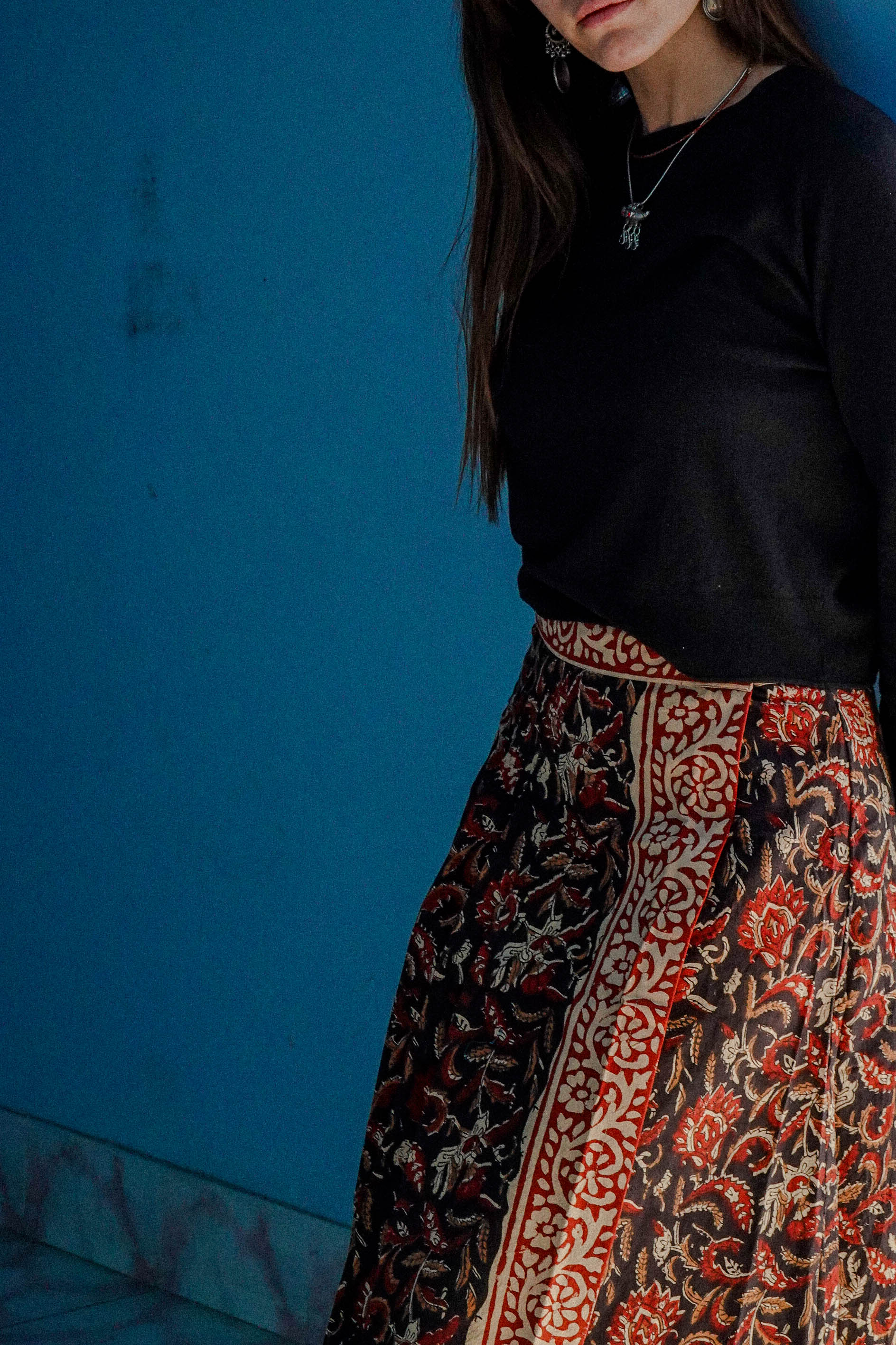 Le gonne Mayur sono 100% cotone stampate a mano con la tecnica block print e, essendo il tessuto completamente artigianale, potrebbero esserci delle irregolarità nella stampa: è la peculiarità e bellezza del fatto a mano!