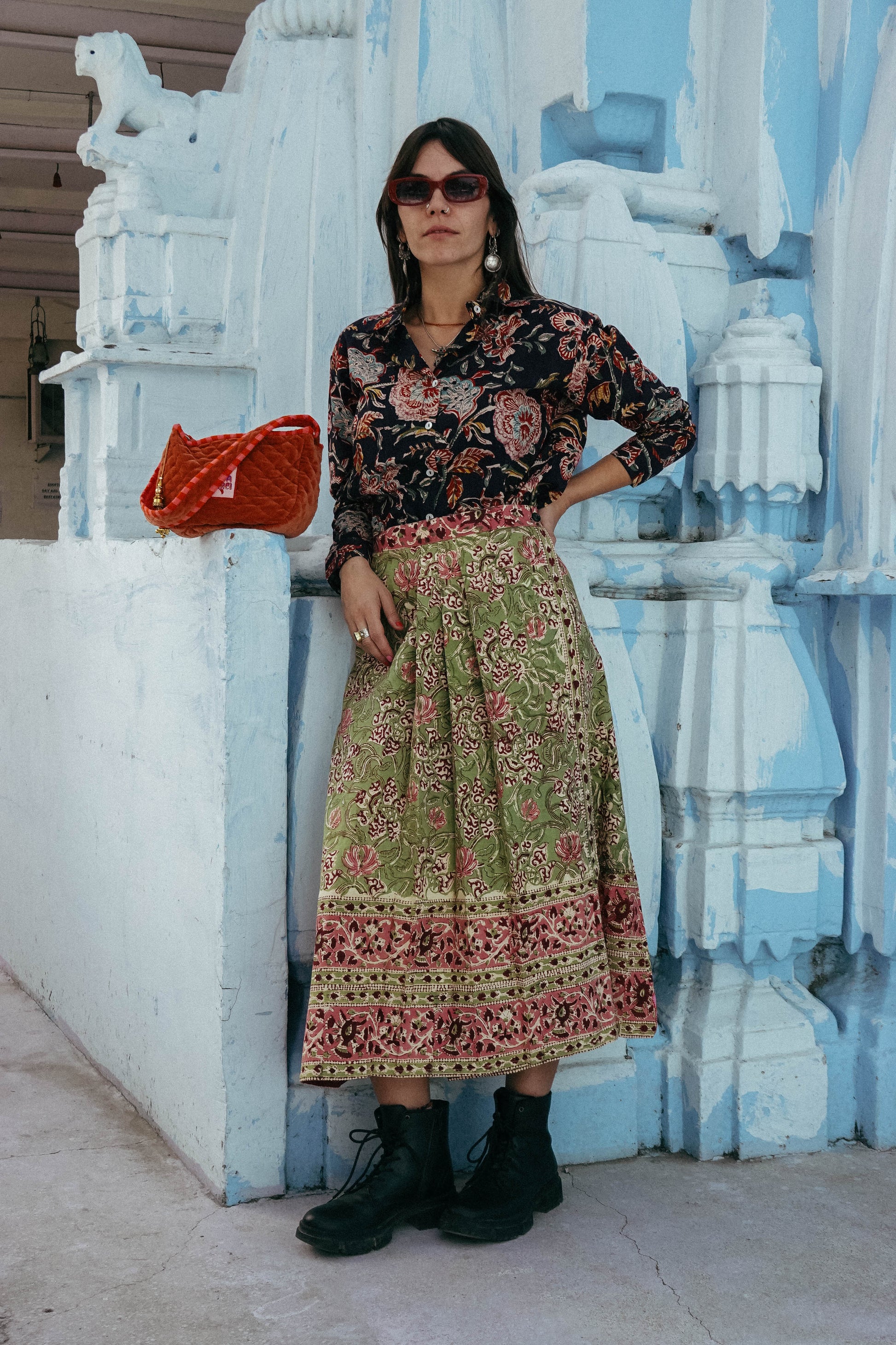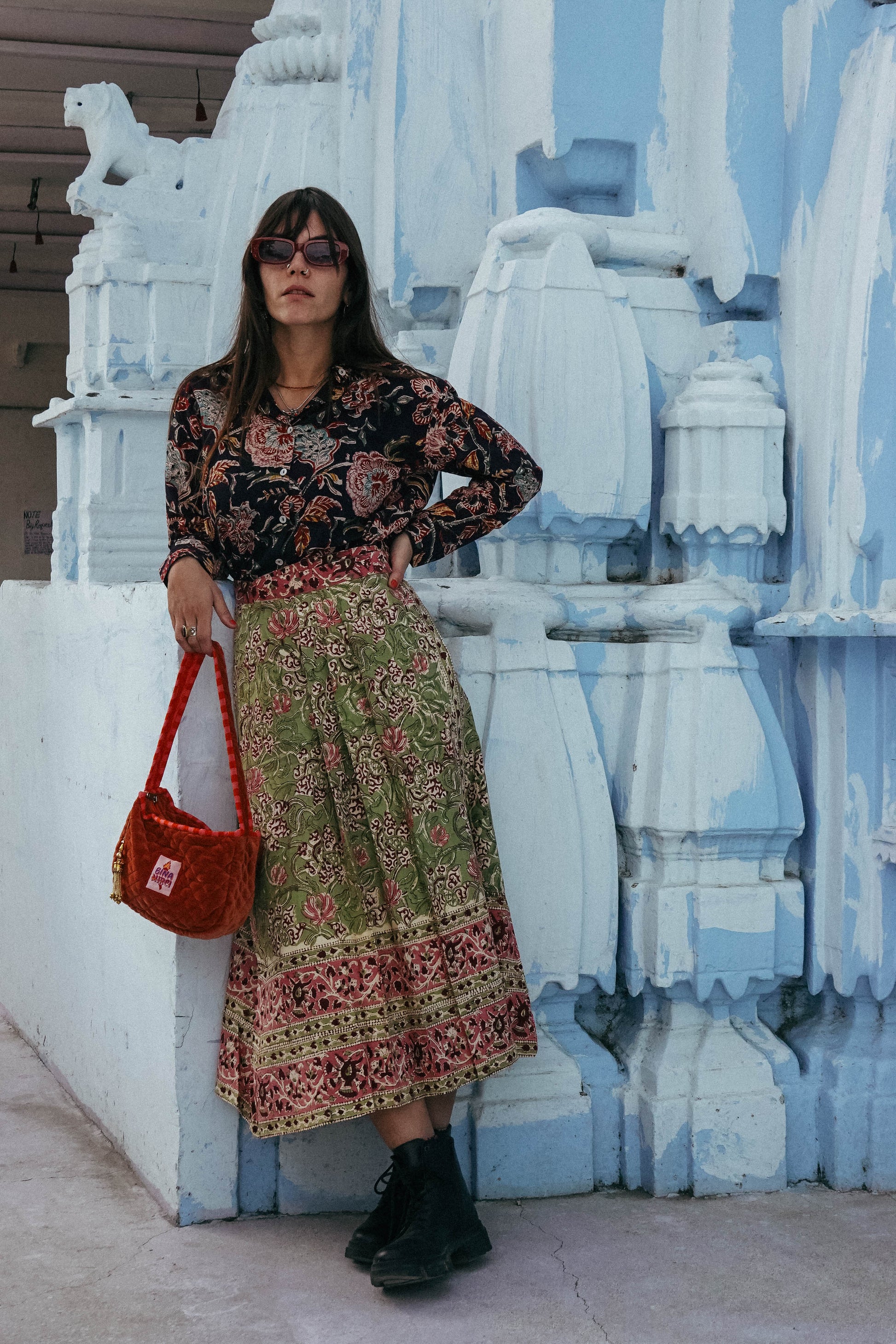 La gonna Mayur è pensata per poter essere indossata sia con climi più freddi che con climi più caldi: è infatti realizzata in cotone block print più spesso e sostenuto del normale cotone, così ti basterà indossarla con i collant per renderla più adatta alle temperature invernali, oppure senza niente nelle stagioni più calde :)