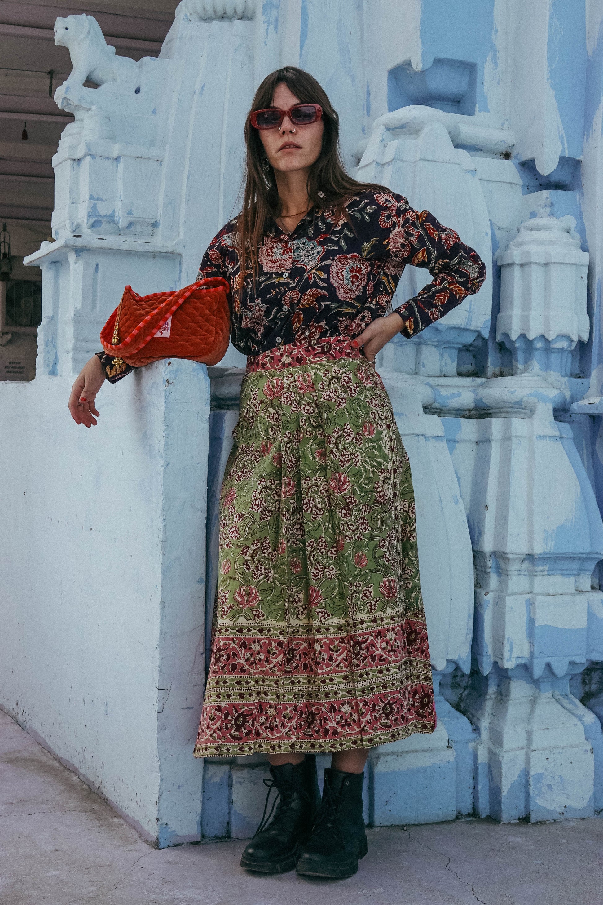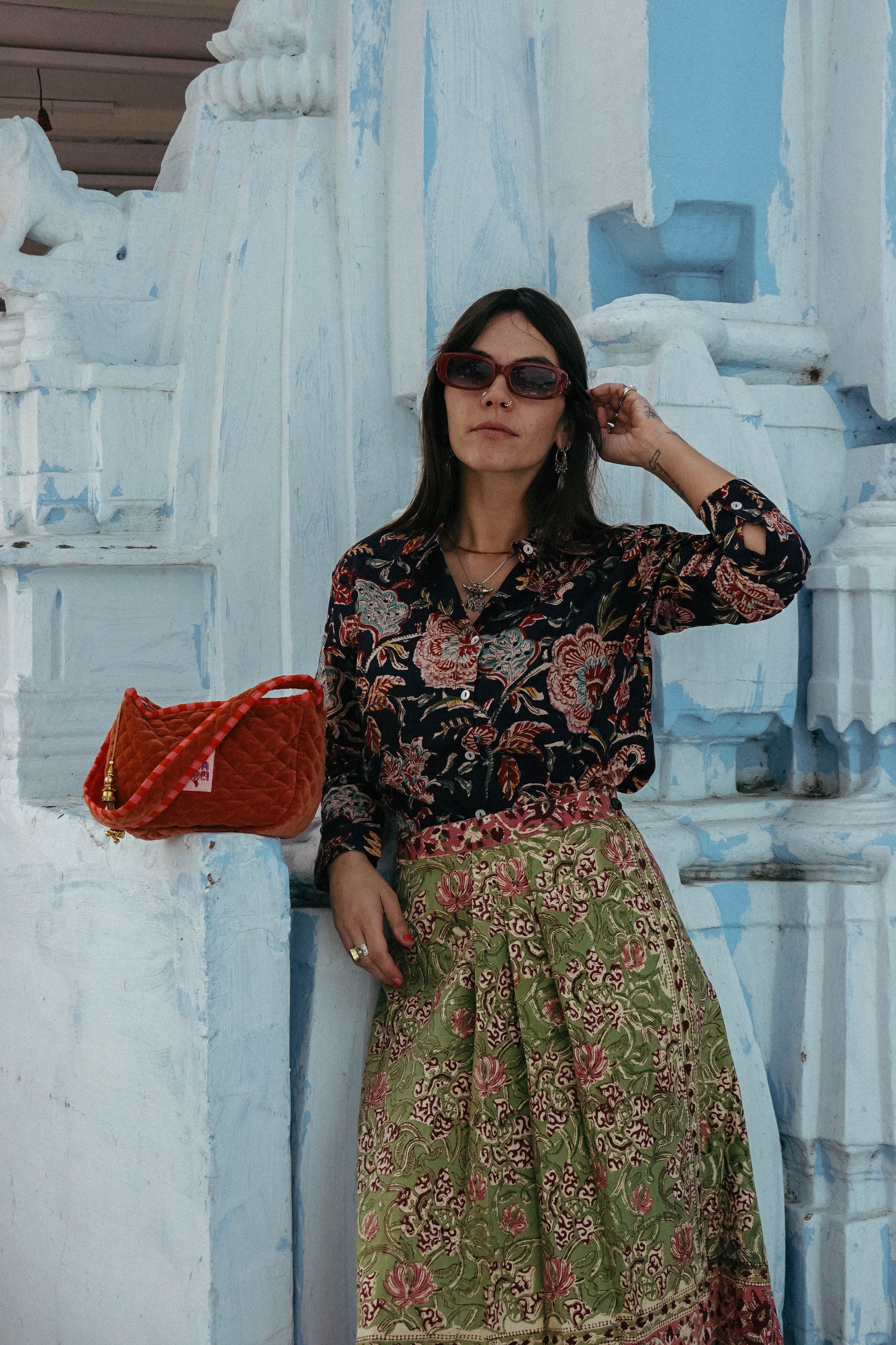 Le gonne Mayur sono 100% cotone stampate a mano con la tecnica block print e, essendo il tessuto completamente artigianale, potrebbero esserci delle irregolarità nella stampa: è la peculiarità e bellezza del fatto a mano!