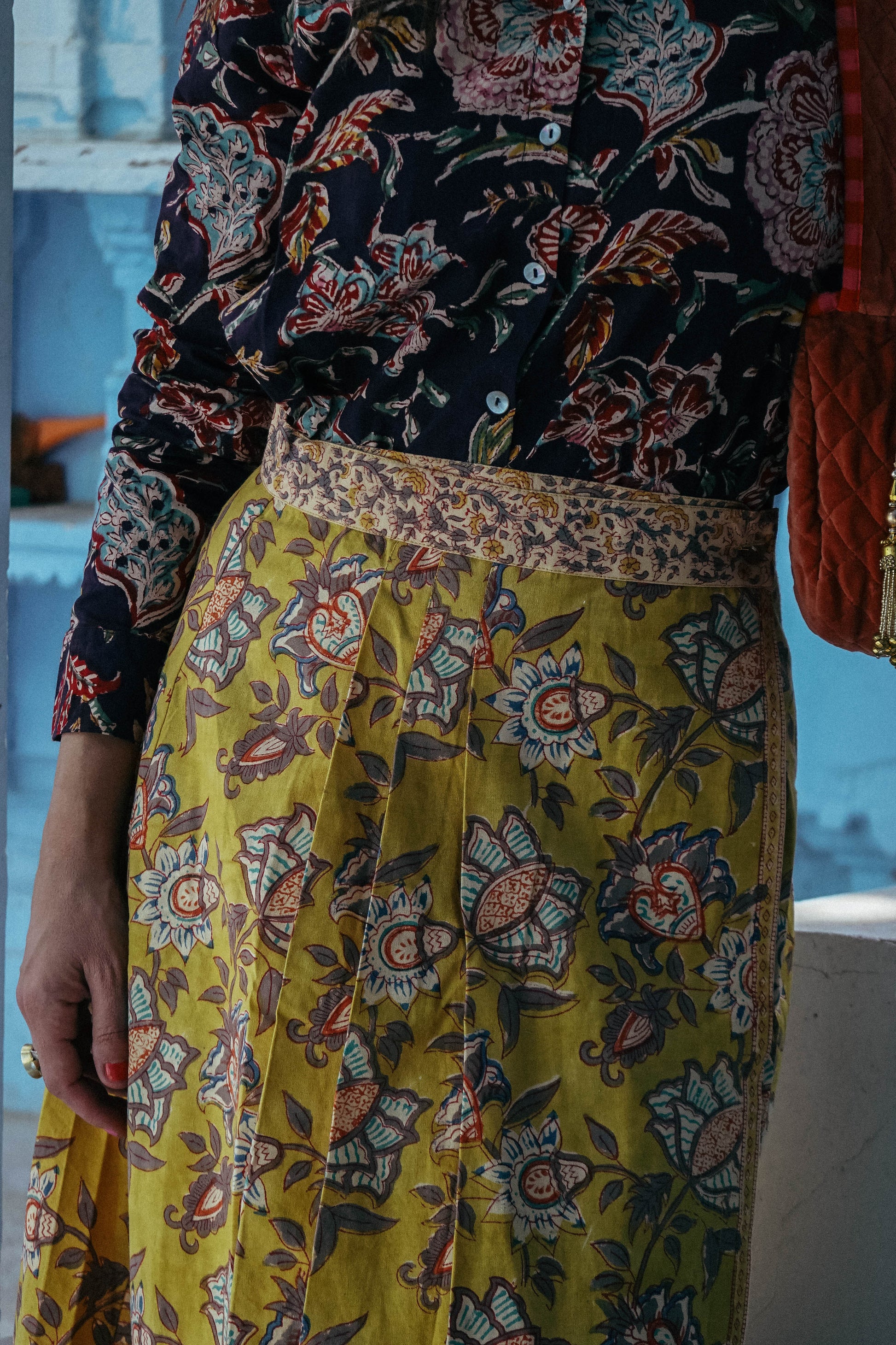Le gonne Mayur sono 100% cotone stampate a mano con la tecnica block print e, essendo il tessuto completamente artigianale, potrebbero esserci delle irregolarità nella stampa: è la peculiarità e bellezza del fatto a mano!