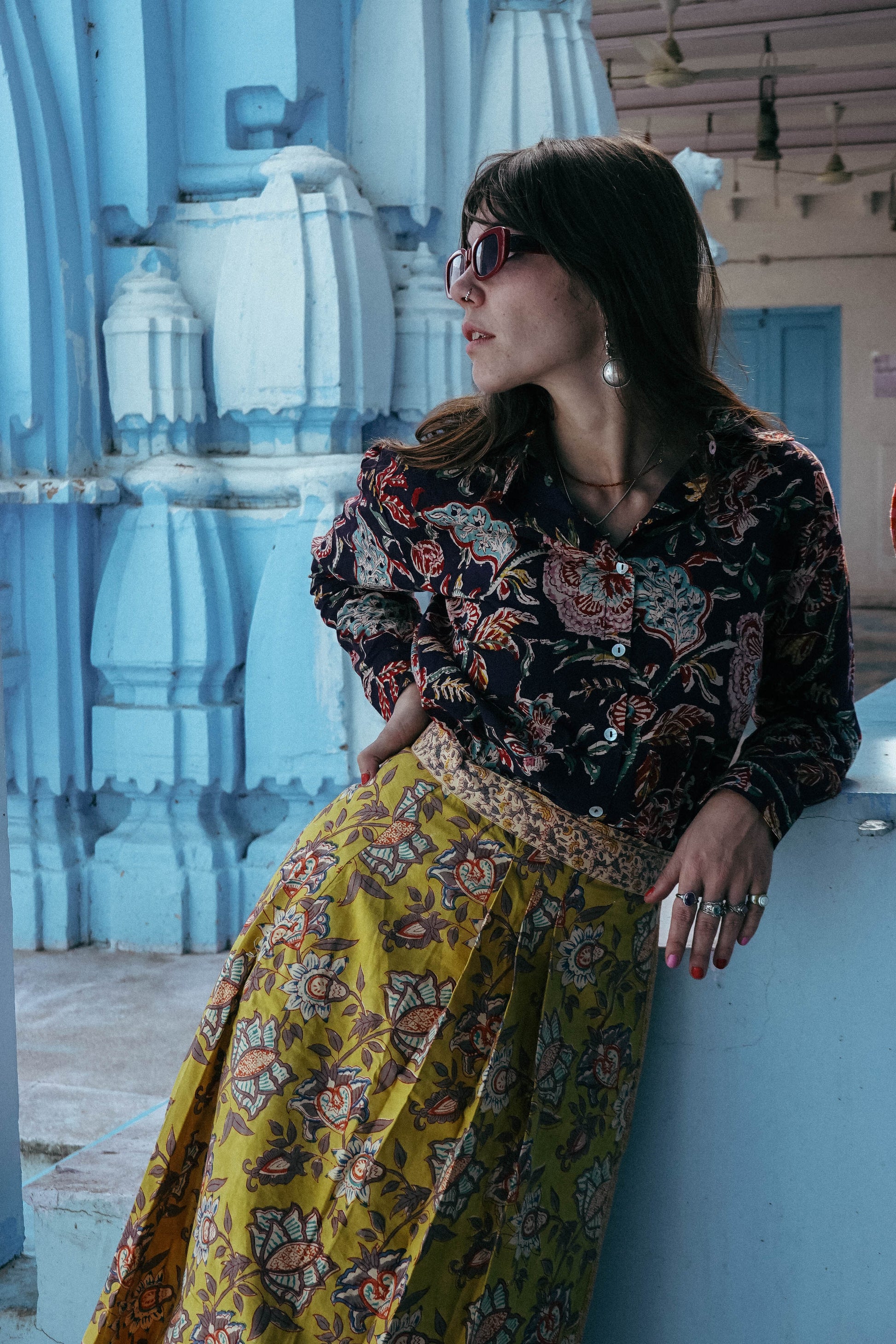 In inverno puoi abbinarla con dei maglioni, con le nostre Quilted Jackets, con le Bluse Jalebi o con gli Abiti Tara aperti sopra; in estate puoi abbinarle con i Camicioni Shani, le camicie Aisha (in foto, Giada indossa la Camicia Aisha blu), Padma e Vasant, oppure con una canottiera a tinta unita.