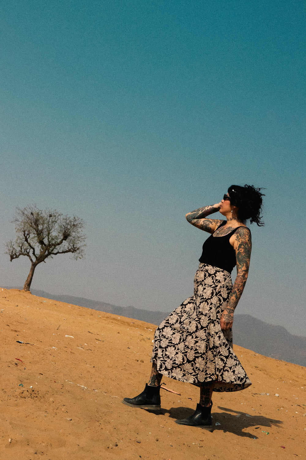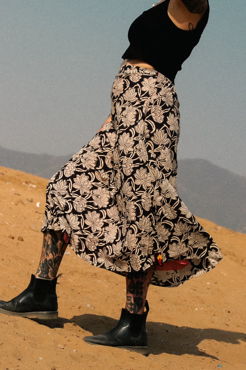 La gonna Nimbu ha una linea ad A semplice e pulita, pensata per essere un capo facile da indossare e da abbinare. La lunghezza arriva circa tra lo stinco e la caviglia - a seconda dell’altezza di chi la indossa!