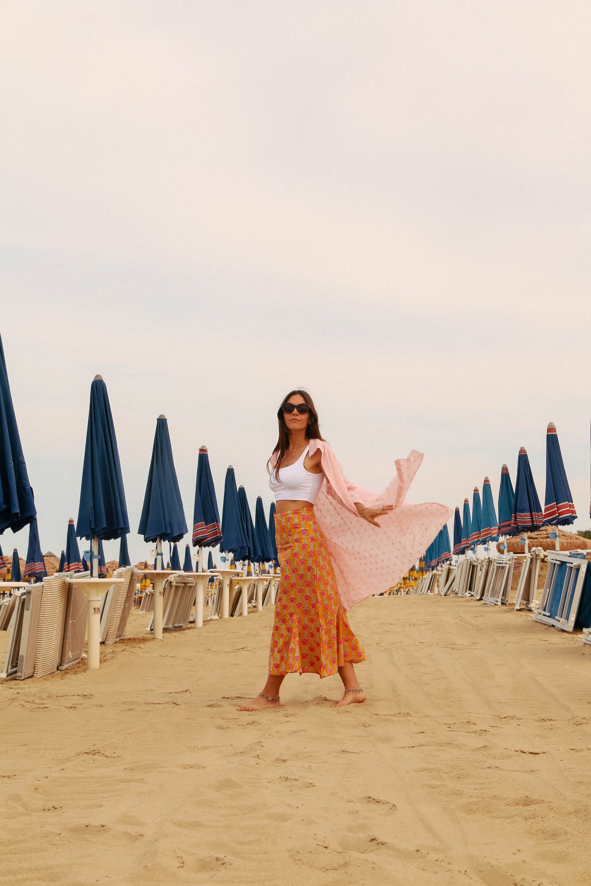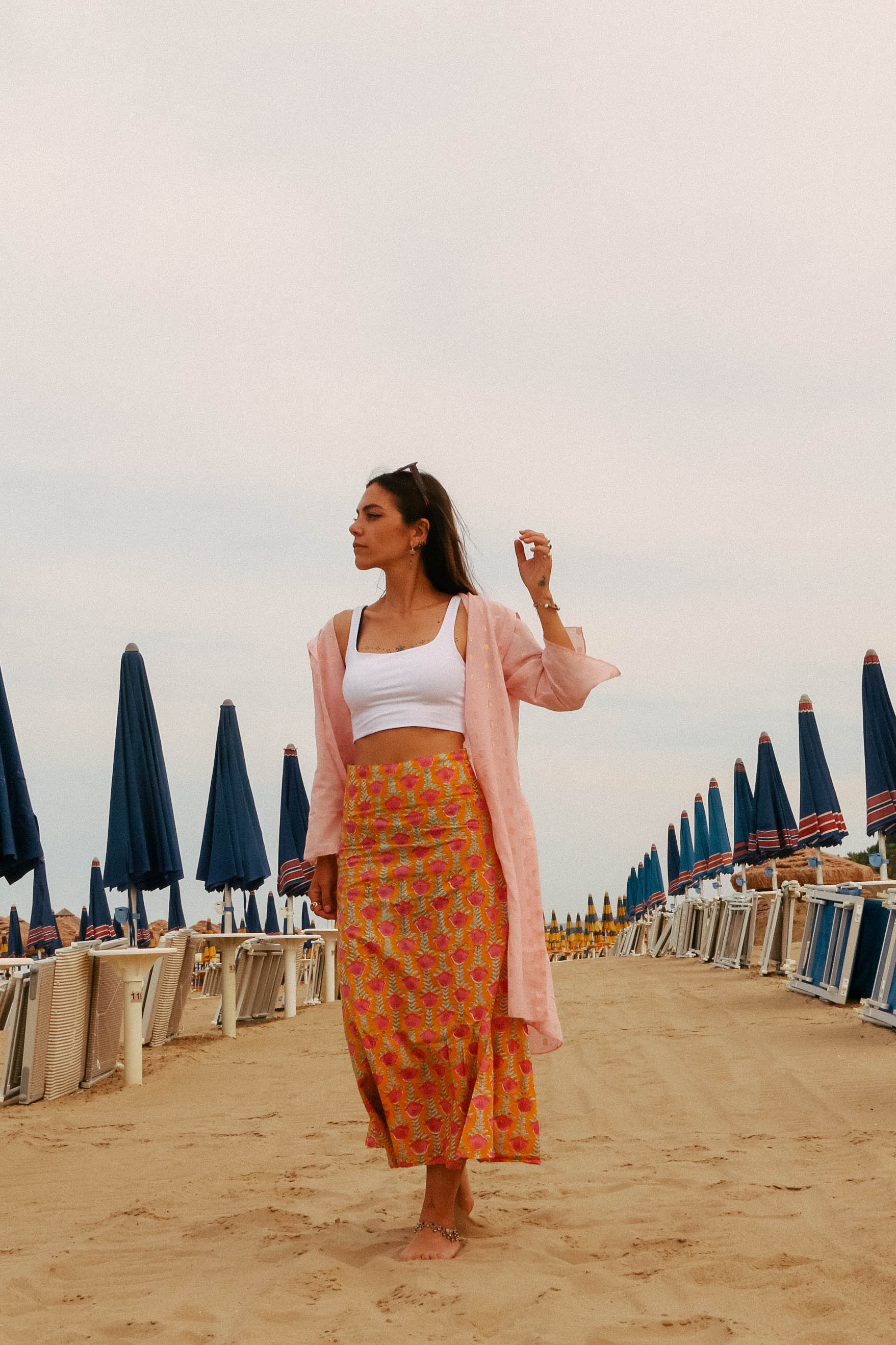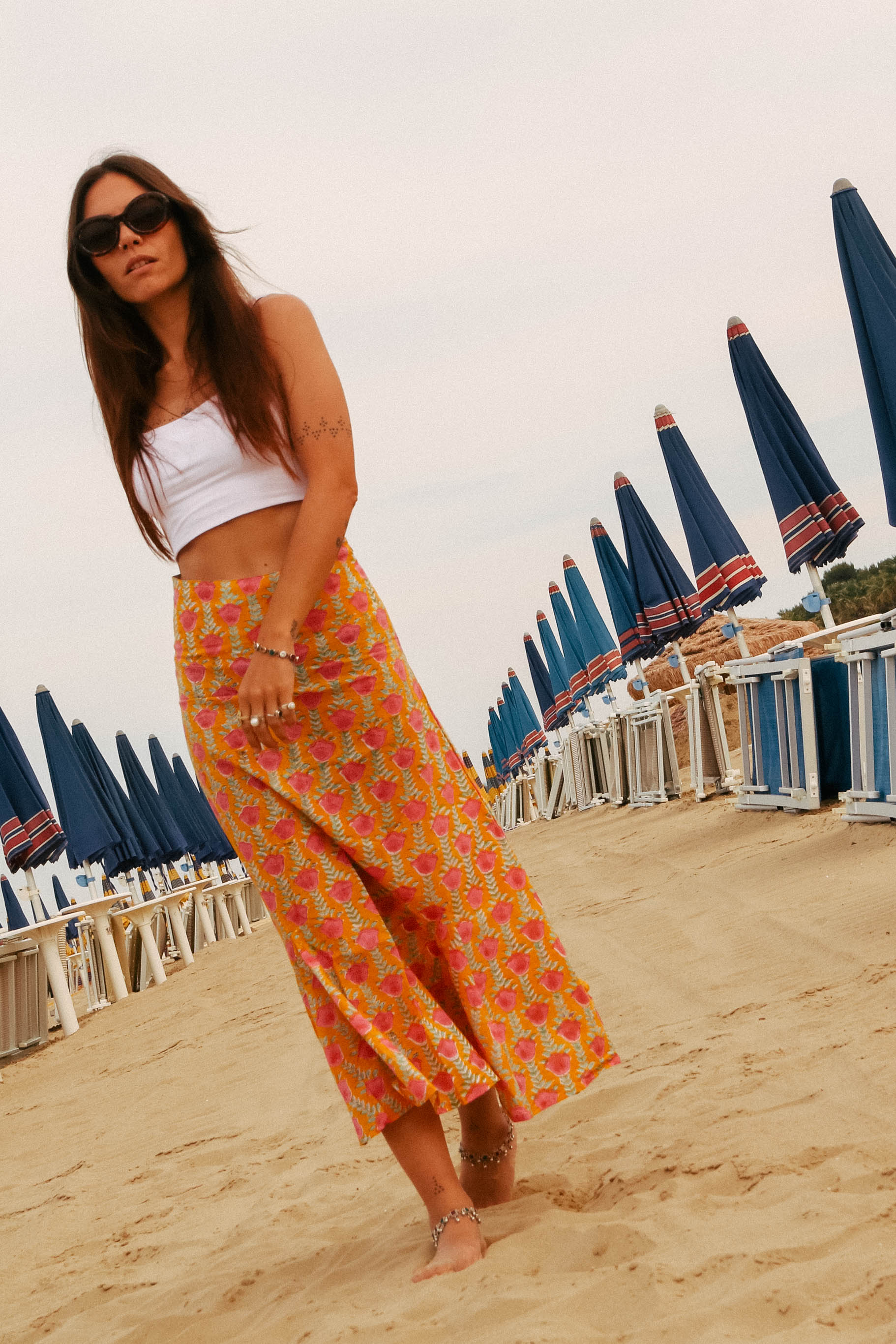 Si chiude con una zip laterale invisibile, e anche lei è 100% cotone stampata manualmente con la tecnica del block print - essendo il tessuto completamente artigianale, potrebbero esserci delle irregolarità nella stampa: è la peculiarità e bellezza del fatto a mano!