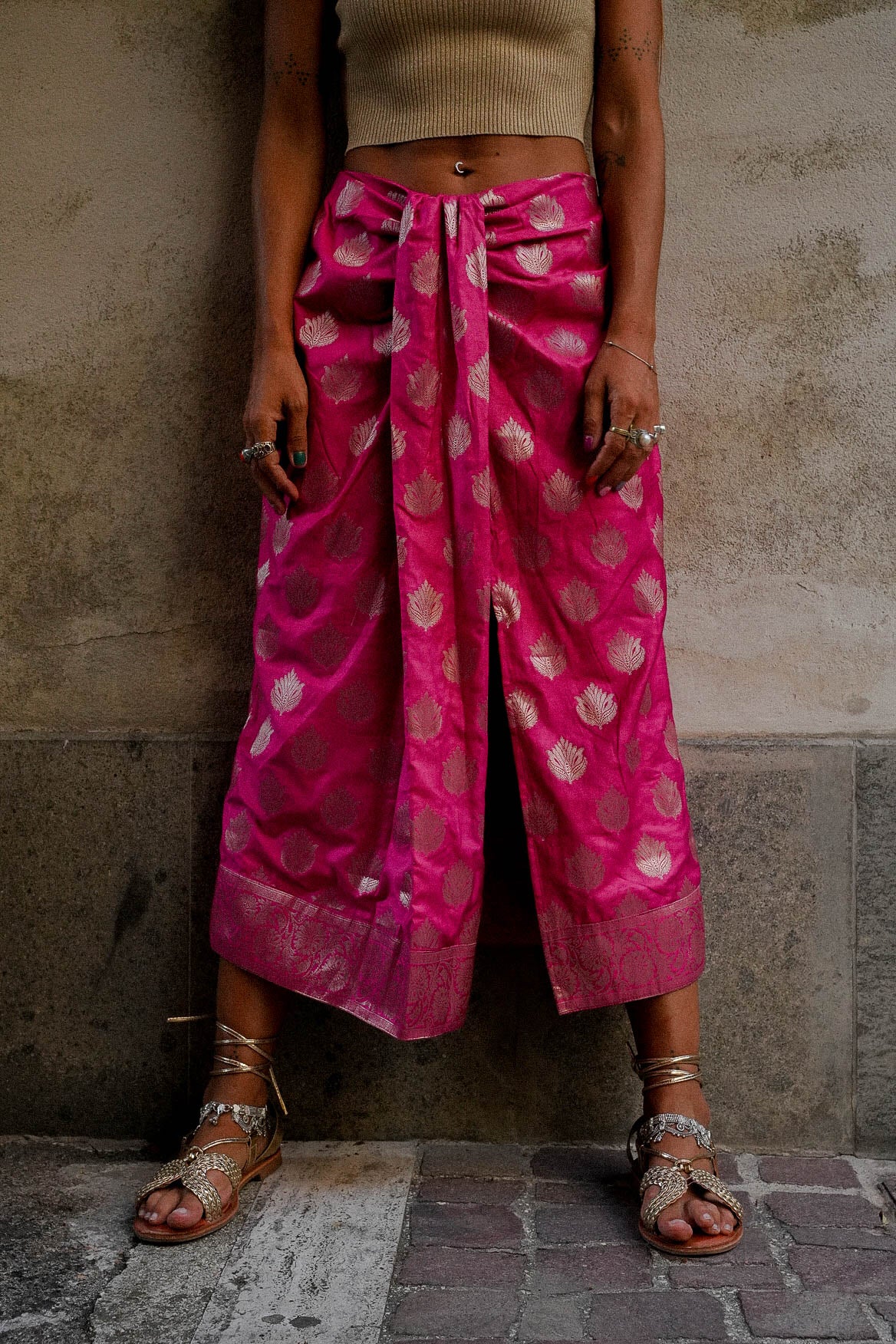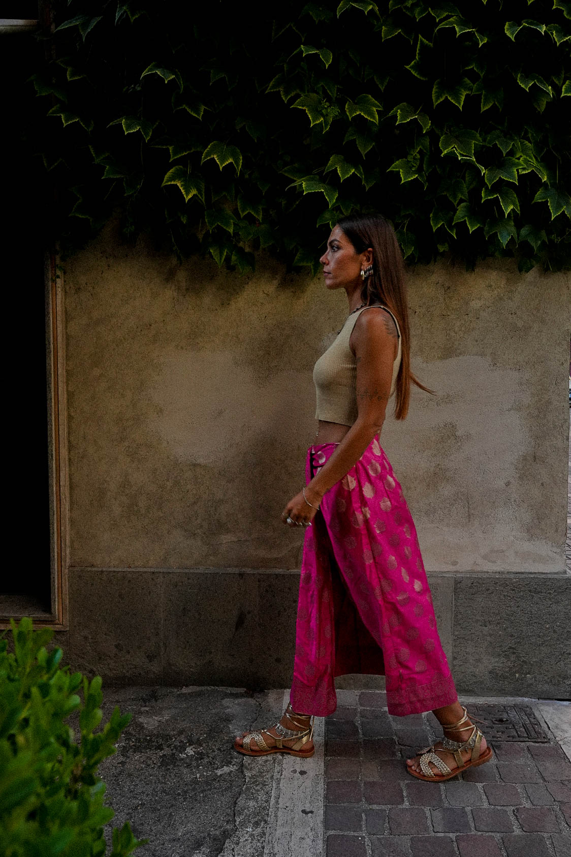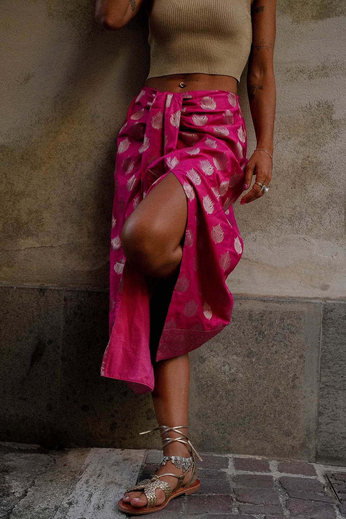 La gonna è ispirata ai saree delle donne indiane, con una piccola cascata di tessuto sul davanti che richiama appunto il davanti dei saree, ha uno spacco frontale e si chiude con una zip laterale nascosta.