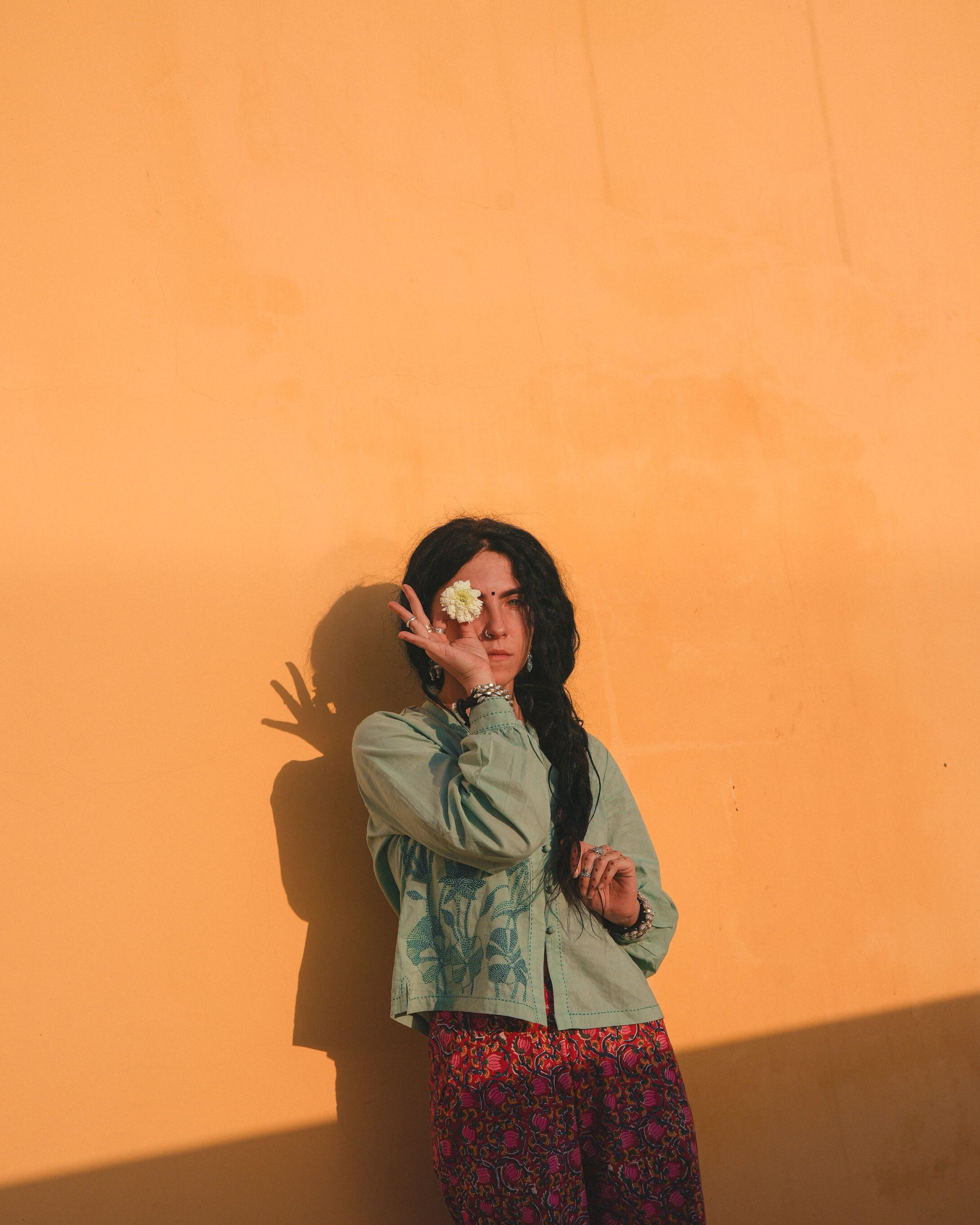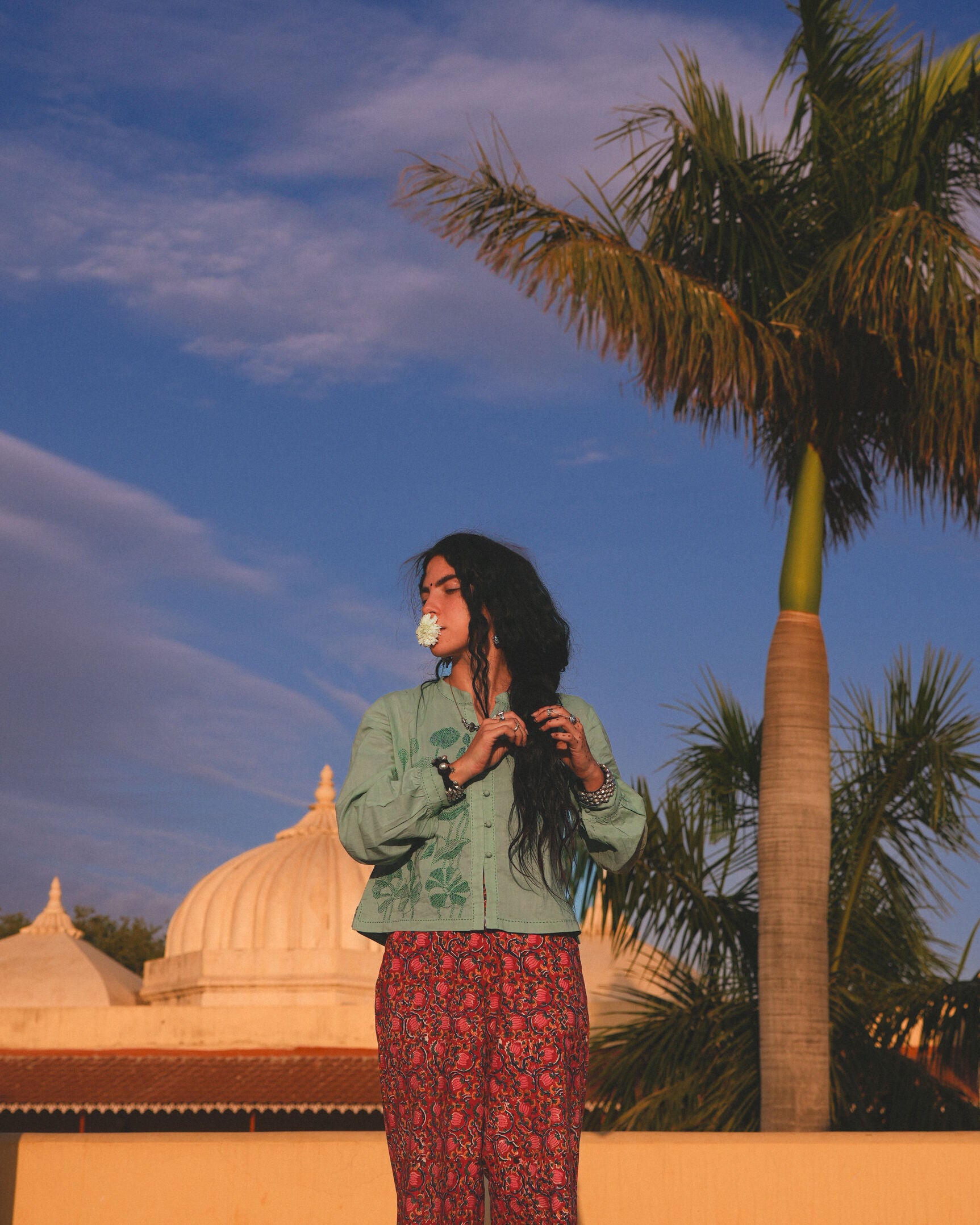I pantaloni Kamal sono 100% cotone stampati a mano con la tecnica block print, e sono pensati per accompagnarti ovunque tu vada! Il cotone utilizzato per questi pantaloni ha una mano leggermente pesante, il che li rende perfetti anche con un clima più fresco!