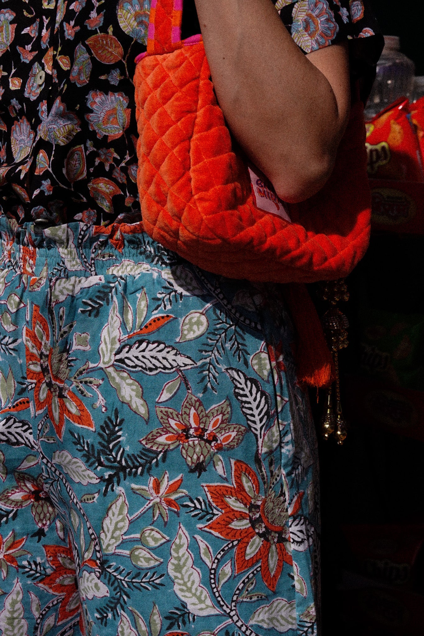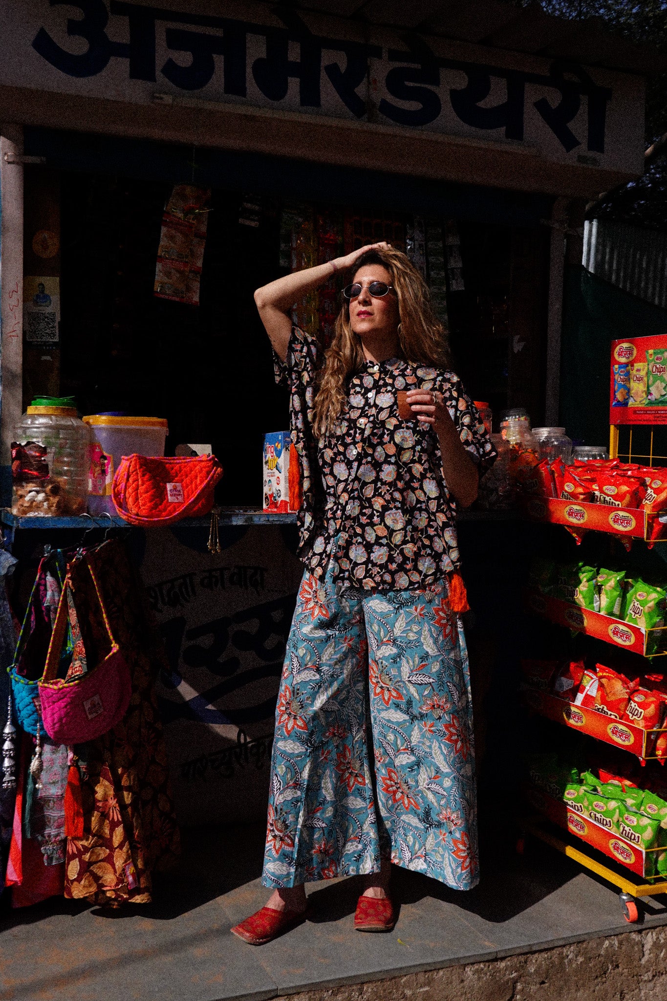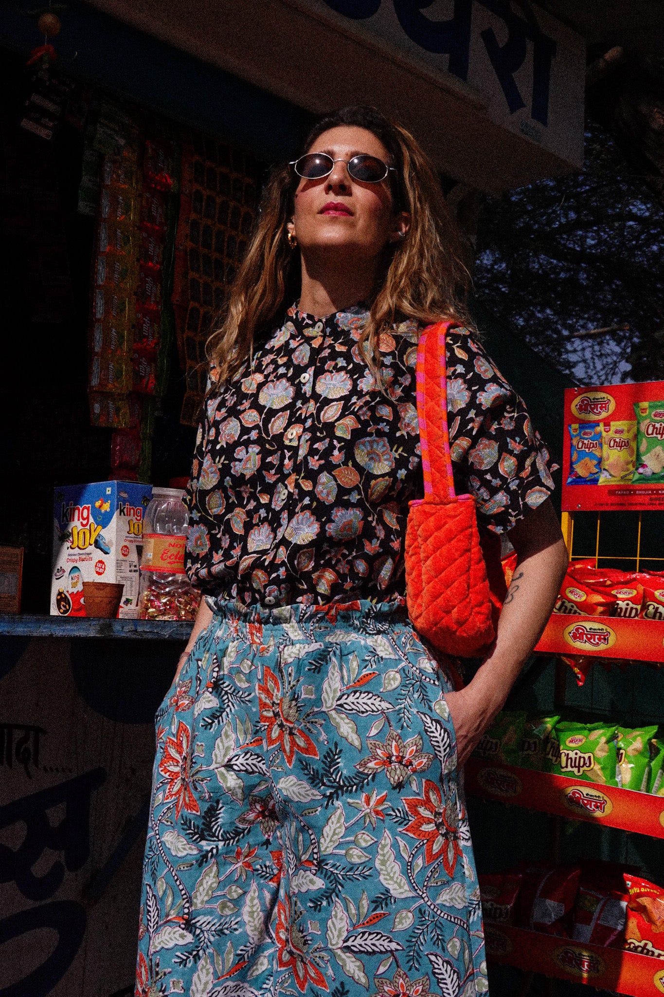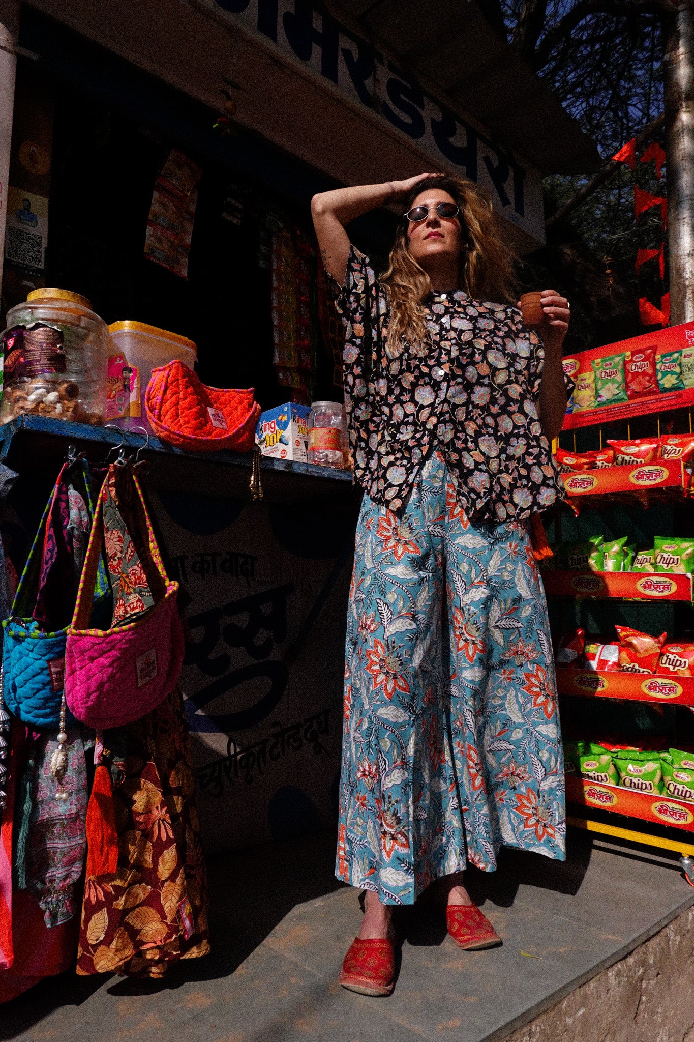 I pantaloni Indira sono 100% cotone stampati a mano con la tecnica block print: il cotone che abbiamo scelto per realizzarli è abbastanza spesso e pesante, il che li rende perfetti per essere indossati anche con un clima più fresco e/o con una calzamaglia sotto.