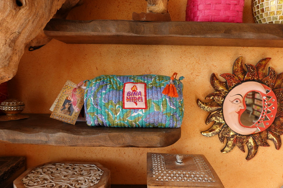 La pochette è in cotone block print e le dimensioni sono 21cm x 12cm x 8cm.